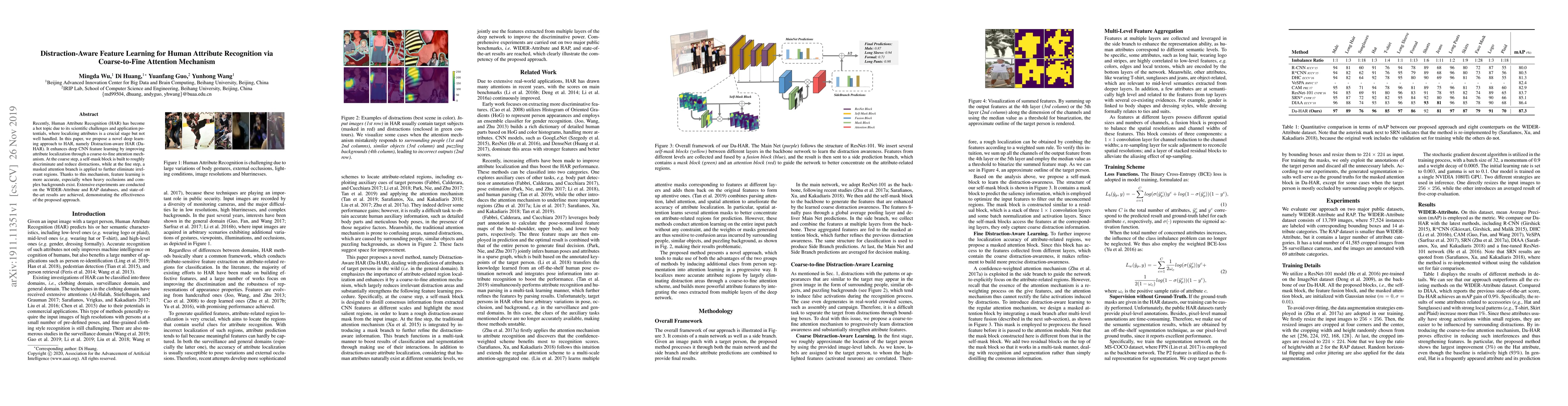 This paper proposes Distraction-aware HAR (Da-HAR) to improve Human Attribute Recognition via a coarse-to-fine attention mechanism that enhances deep CNN feature learning by localizing attributes more accurately, especially under occlusions and complex backgrounds. Experiments on WIDER-Attribute and RAP databases show state-of-the-art results.