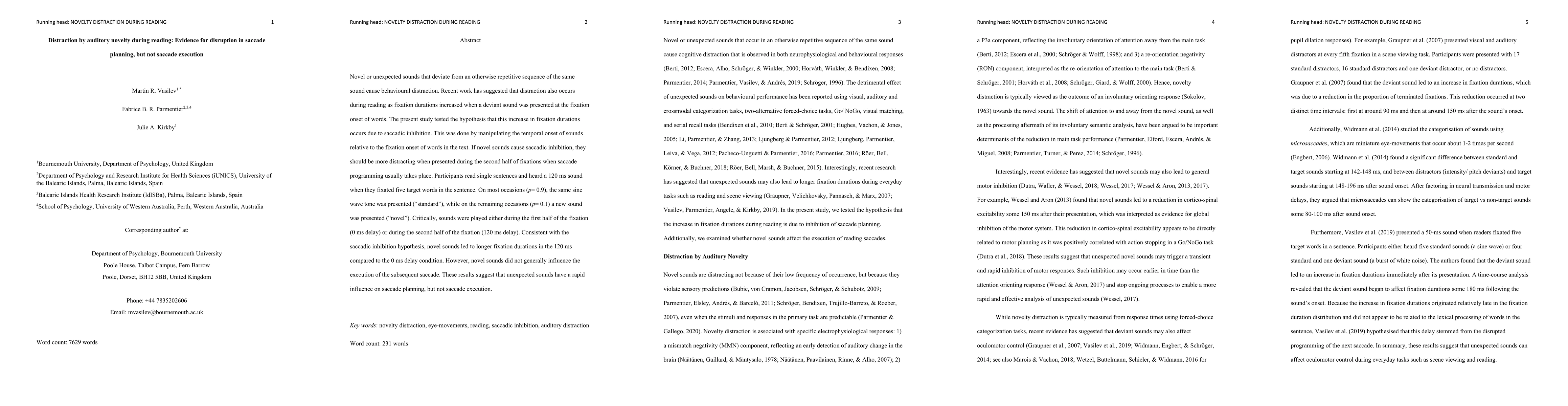 This study found that unexpected auditory novel sounds increase fixation durations during reading, indicating distraction during saccade planning. However, these sounds did not affect the execution of saccades, suggesting that while they disrupt the planning phase, they do not interfere with the actual movement.