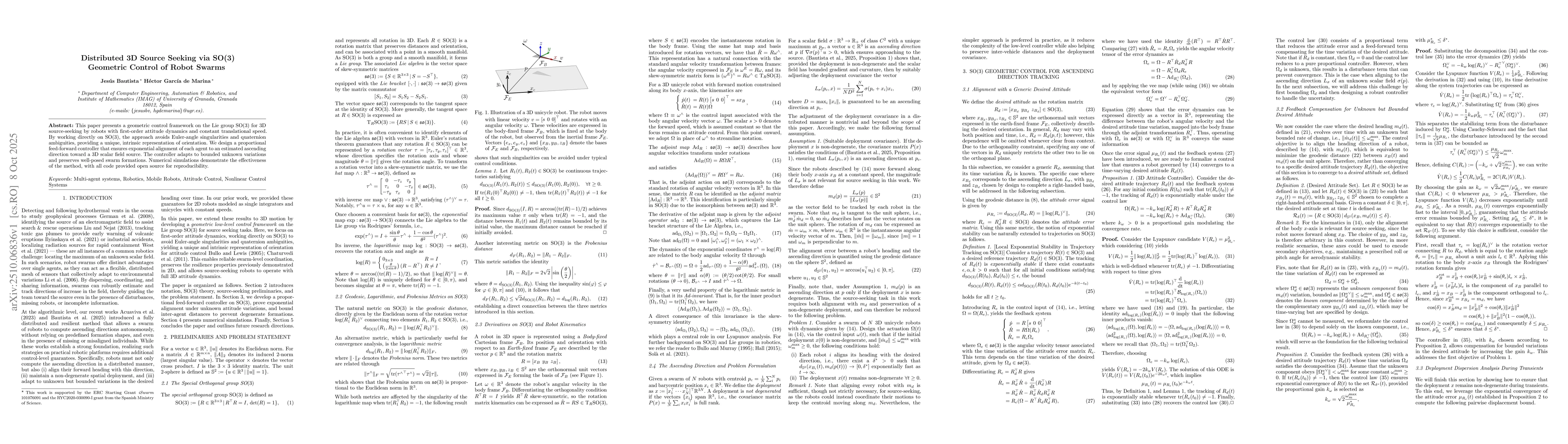 The research develops a geometric controller on SO(3) for 3D source-seeking using a swarm of unicycles, combining attitude control with deployment preservation through proportional gains and dispersion analysis.