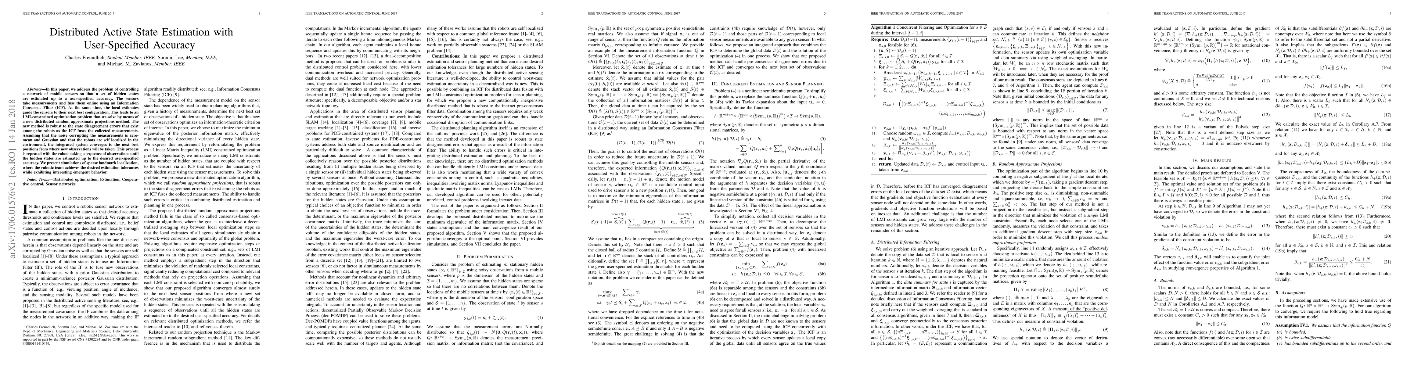 In this paper, we address the problem of controlling a network of mobile sensors so that a set of hidden states are estimated up to a user-specified accuracy. The sensors take measurements and fuse them online using an Information Consensus Filter (ICF). At the same time, the local estimates guide the sensors to their next best configuration. This leads to an LMI-constrained optimization problem that we solve by means of a new distributed random approximate projections method. The new method is robust to the state disagreement errors that exist among the robots as the ICF fuses the collected measurements. Assuming that the noise corrupting the measurements is zero-mean and Gaussian and that the robots are self localized in the environment, the integrated system converges to the next best positions from where new observations will be taken. This process is repeated with the robots taking a sequence of observations until the hidden states are estimated up to the desired user-specified accuracy. We present simulations of sparse landmark localization, where the robotic team achieves the desired estimation tolerances while exhibiting interesting emergent behavior.