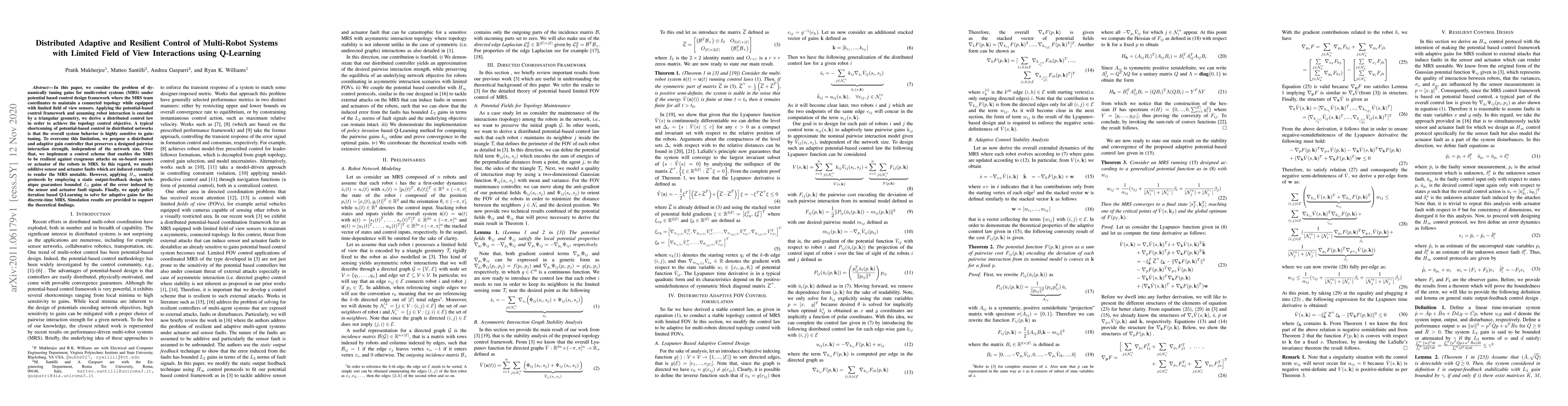 This paper proposes a distributed adaptive control scheme for multi-robot systems (MRS) with limited field of view, using Q-Learning to dynamically tune gains. It addresses the sensitivity of potential-based control to gain-tuning and ensures resilience against external sensor and actuator faults.