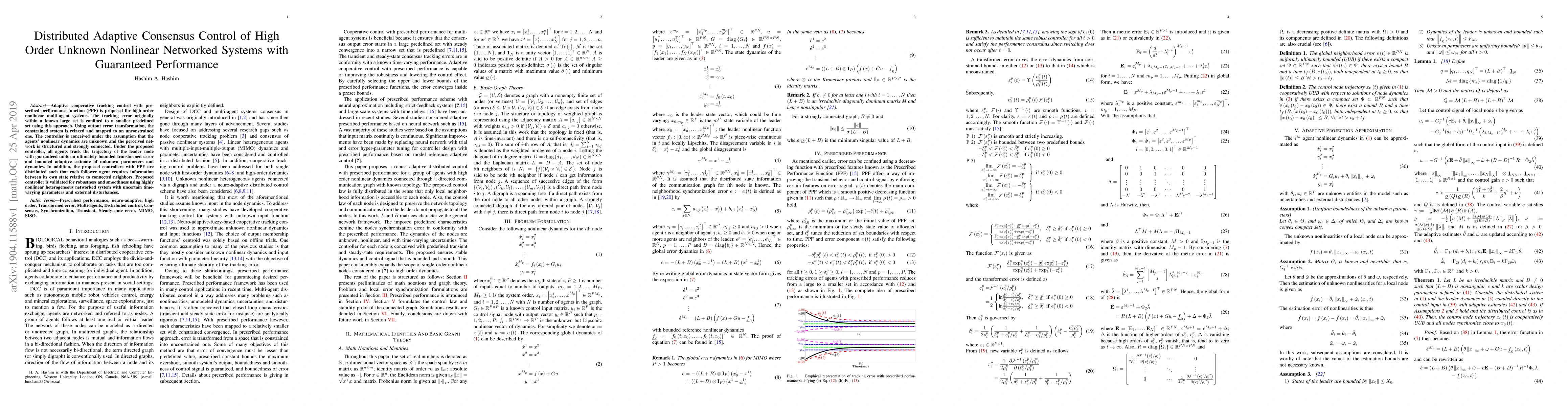 Adaptive cooperative tracking control with prescribed performance function (PPF) is proposed for high-order nonlinear multi-agent systems. The tracking error originally within a known large set is confined to a smaller predefined set using this approach. Using output error transformation, the constrained system is relaxed and mapped to an unconstrained one. The controller is conceived under the assumption that the agents' nonlinear dynamics are unknown and the perceived network is structured and strongly connected. Under the proposed controller, all agents track the trajectory of the leader node with guaranteed uniform ultimately bounded transformed error and bounded adaptive estimate of unknown parameters and dynamics. In addition, the proposed controllers with PPF are distributed such that each follower agent requires information between its own state relative to connected neighbors. Proposed controller is validated for robustness and smoothness using highly nonlinear heterogeneous networked system with uncertain time-varying parameters and external disturbances. Index Terms: Prescribed performance, neuro-adaptive, high order, Transformed error, Multi-agents, Distributed control, Consensus, Synchronization, Transient, Steady-state error, MIMO, SISO.