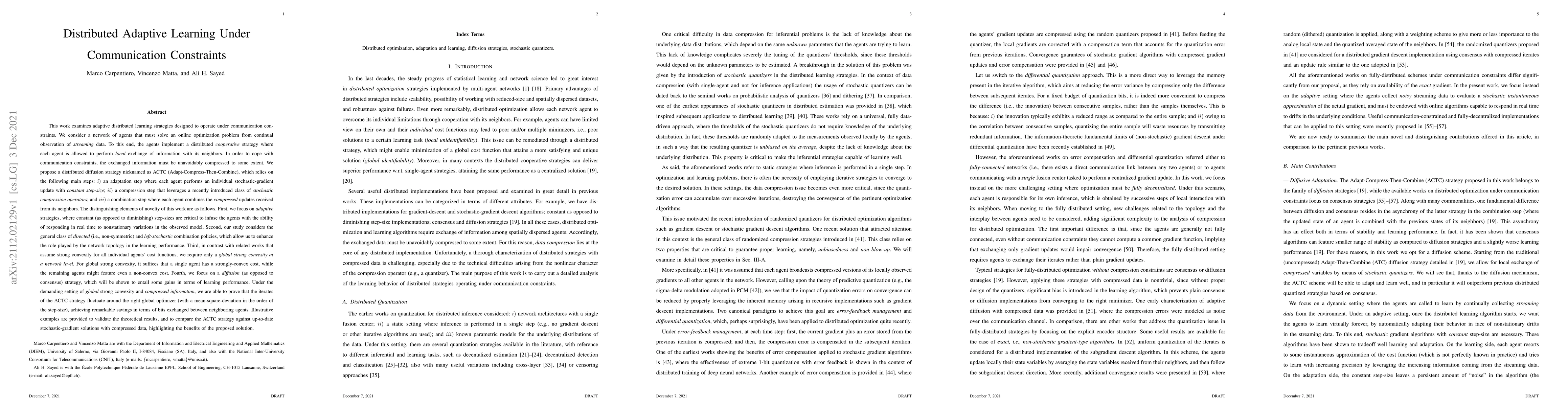 This paper proposes an adaptive distributed learning strategy called ACTC (Adapt-Compress-Then-Combine) to solve online optimization problems under communication constraints. The ACTC strategy involves local stochastic-gradient updates, compression, and neighbor-based information diffusion, enabling real-time adaptation and significant bit savings despite non-convexity in some agents' cost functions.
