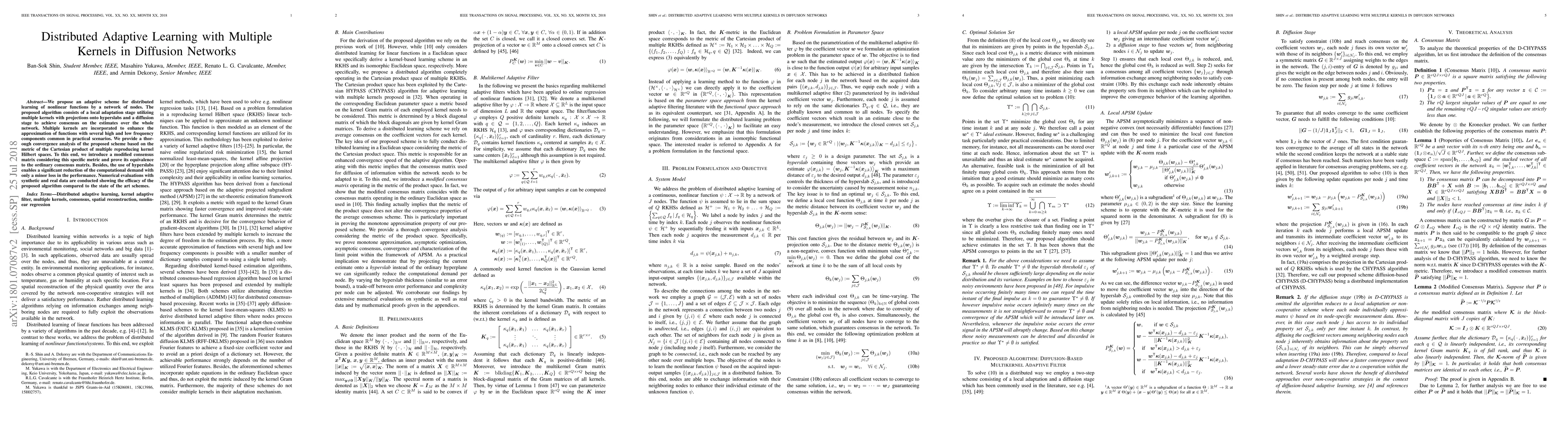 This paper proposes an adaptive distributed learning algorithm using multiple kernels in diffusion networks to enhance function approximation. The algorithm combines local adaptation with multiple kernels and a diffusion stage for consensus, showing reduced computational demand and improved performance, as demonstrated through numerical evaluations.