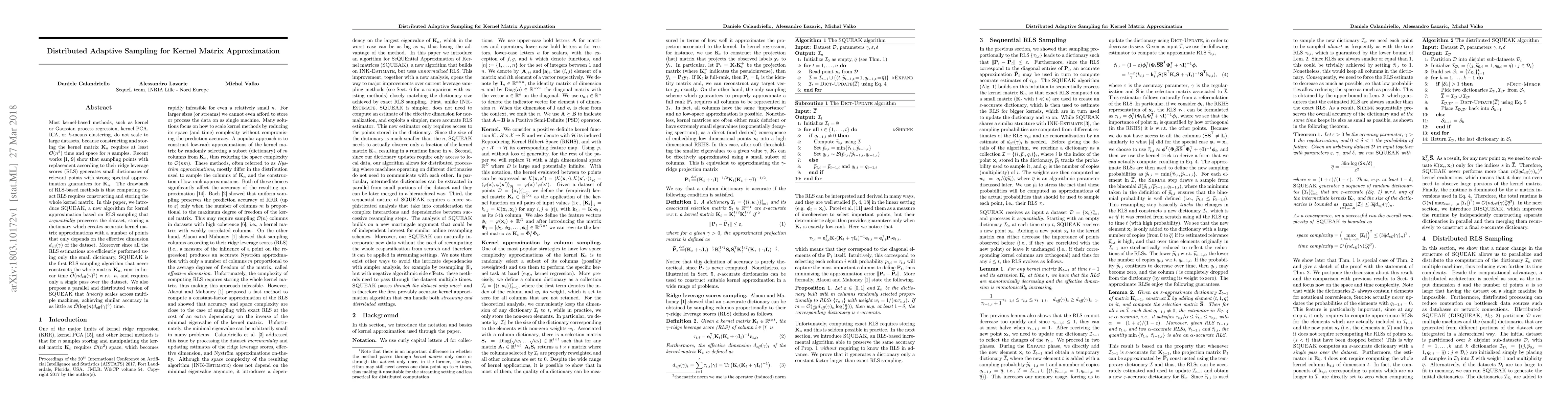 This paper introduces SQUEAK, a distributed adaptive sampling algorithm for kernel matrix approximation that leverages ridge leverage scores (RLS). Unlike traditional methods, SQUEAK avoids constructing the full kernel matrix, running in linear time and requiring only a single dataset pass, while achieving accurate approximations based on effective dimension. A parallel version of SQUEAK scales across multiple machines, maintaining accuracy with reduced time complexity.