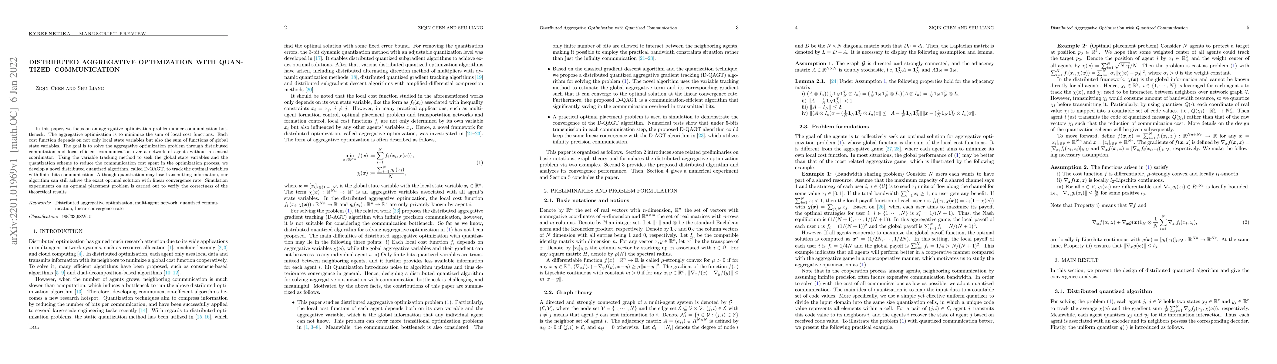 This paper proposes D-QAGT, a novel distributed algorithm for solving aggregative optimization problems under communication constraints. It leverages quantization to reduce communication costs and achieves exact optimal solutions with linear convergence, verified through simulations on an optimal placement problem.