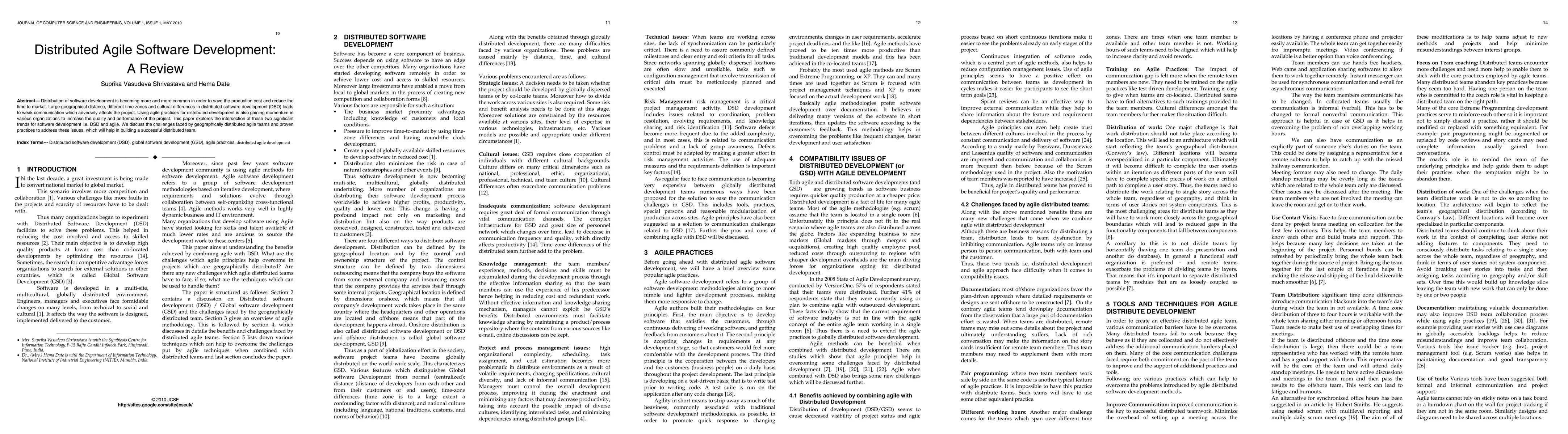 This paper reviews distributed agile software development, highlighting challenges such as weak communication due to geographical distances and cultural differences, and explores proven practices to enhance team performance and project quality.