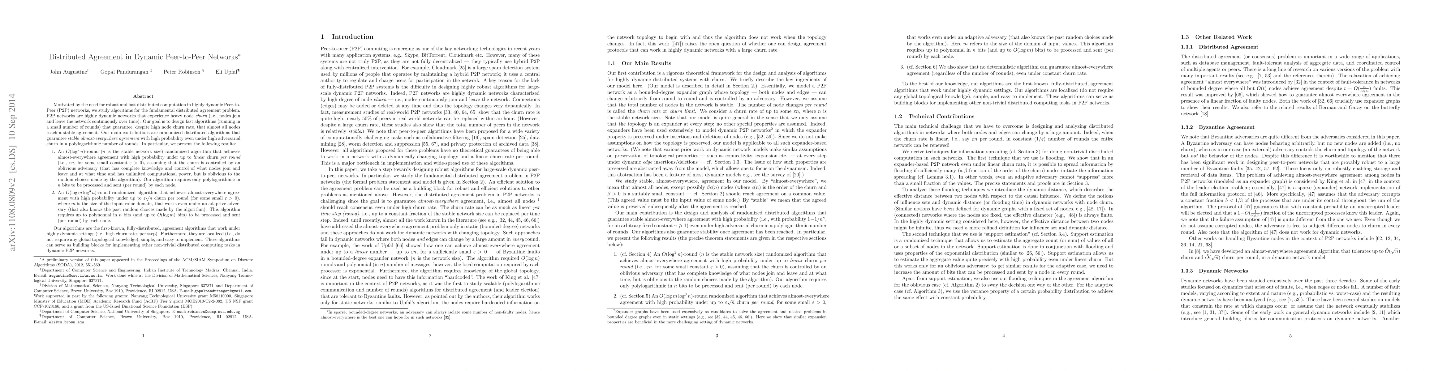 Researchers developed algorithms for distributed agreement in dynamic Peer-to-Peer networks to ensure almost-everywhere agreement despite high node churn rates, with solutions running in a small number of rounds.