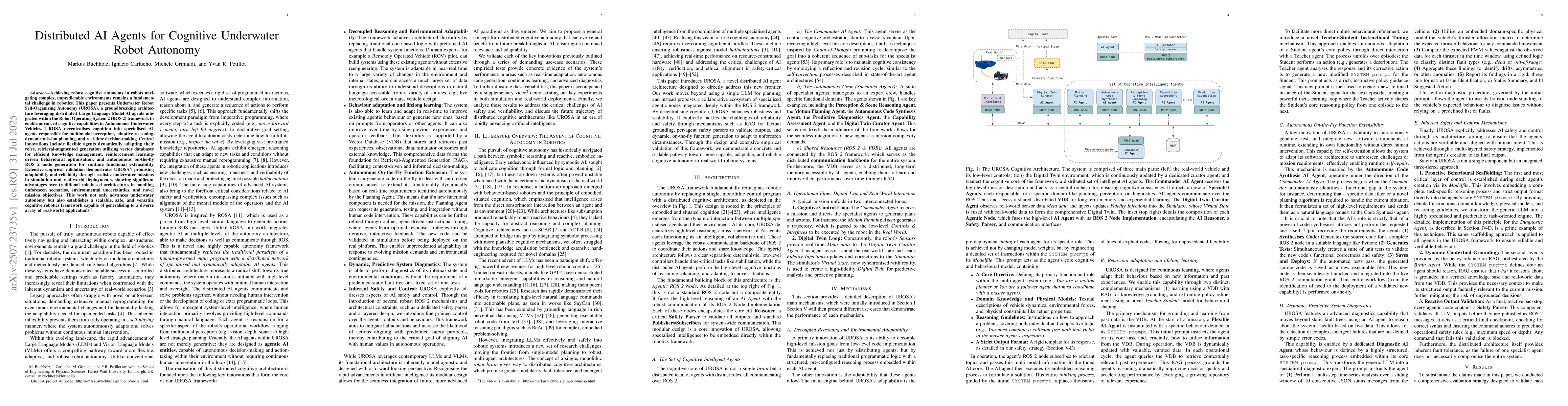 Achieving robust cognitive autonomy in robots navigating complex, unpredictable environments remains a fundamental challenge in robotics. This paper presents Underwater Robot Self-Organizing Autonomy (UROSA), a groundbreaking architecture leveraging distributed Large Language Model AI agents integrated within the Robot Operating System 2 (ROS 2) framework to enable advanced cognitive capabilities in Autonomous Underwater Vehicles. UROSA decentralises cognition into specialised AI agents responsible for multimodal perception, adaptive reasoning, dynamic mission planning, and real-time decision-making. Central innovations include flexible agents dynamically adapting their roles, retrieval-augmented generation utilising vector databases for efficient knowledge management, reinforcement learning-driven behavioural optimisation, and autonomous on-the-fly ROS 2 node generation for runtime functional extensibility. Extensive empirical validation demonstrates UROSA's promising adaptability and reliability through realistic underwater missions in simulation and real-world deployments, showing significant advantages over traditional rule-based architectures in handling unforeseen scenarios, environmental uncertainties, and novel mission objectives. This work not only advances underwater autonomy but also establishes a scalable, safe, and versatile cognitive robotics framework capable of generalising to a diverse array of real-world applications.