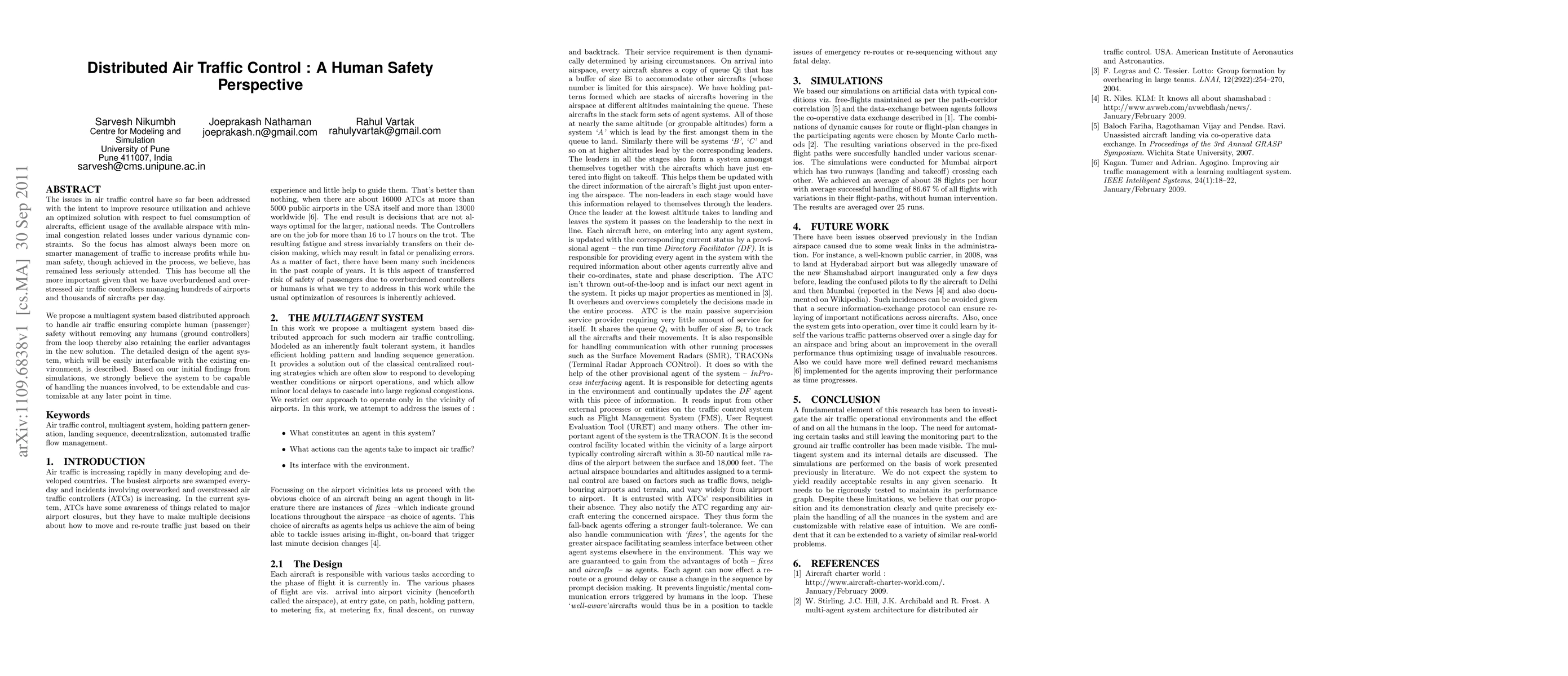 The issues in air traffic control have so far been addressed with the intent to improve resource utilization and achieve an optimized solution with respect to fuel comsumption of aircrafts, efficient usage of the available airspace with minimal congestion related losses under various dynamic constraints. So the focus has almost always been more on smarter management of traffic to increase profits while human safety, though achieved in the process, we believe, has remained less seriously attended. This has become all the more important given that we have overburdened and overstressed air traffic controllers managing hundreds of airports and thousands of aircrafts per day. We propose a multiagent system based distributed approach to handle air traffic ensuring complete human (passenger) safety without removing any humans (ground controllers) from the loop thereby also retaining the earlier advantages in the new solution. The detailed design of the agent system, which will be easily interfacable with the existing environment, is described. Based on our initial findings from simulations, we strongly believe the system to be capable of handling the nuances involved, to be extendable and customizable at any later point in time.