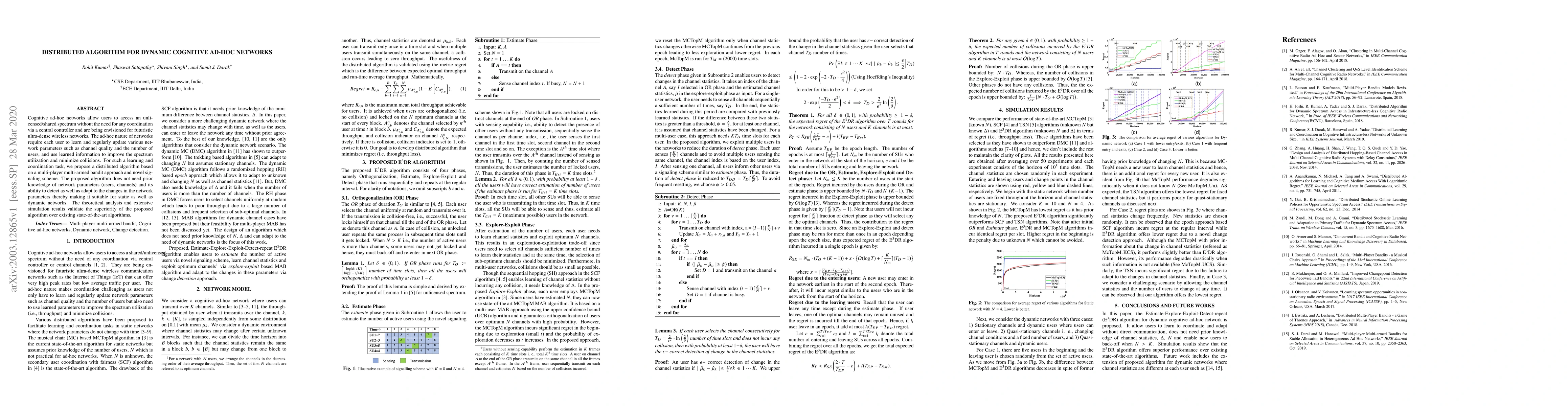 This paper proposes a distributed algorithm for dynamic cognitive ad-hoc networks, leveraging a multi-player multi-armed bandit approach and a novel signaling scheme to optimize spectrum utilization without central coordination. The algorithm adapts to changes in network parameters, outperforming existing methods as shown by theoretical analysis and simulations.