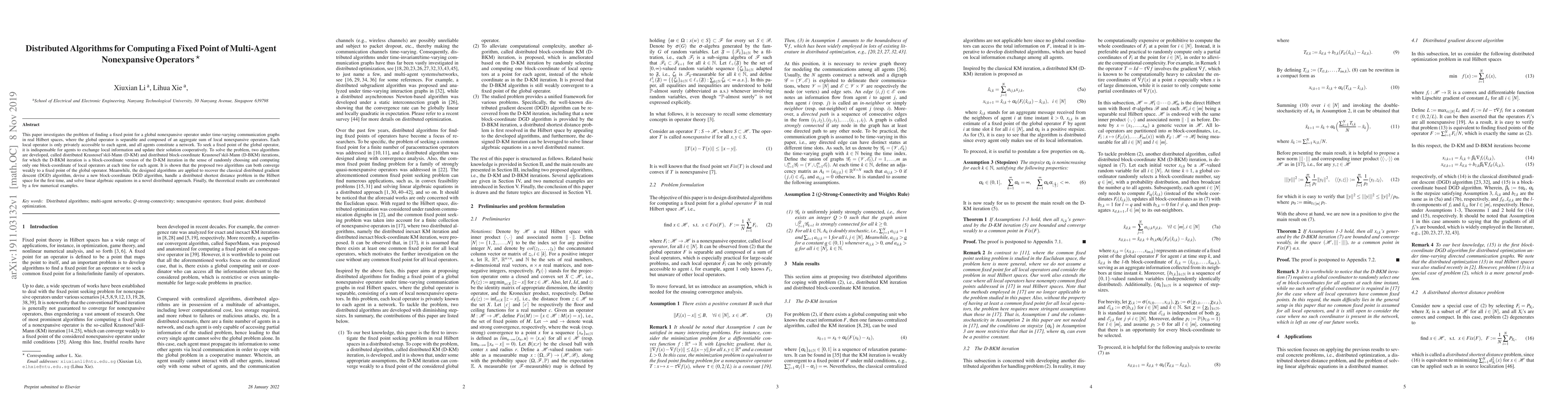 This paper develops distributed algorithms for finding fixed points of global nonexpansive operators in real Hilbert spaces, where each agent has access to only local operators. The proposed D-KM and D-BKM iterations converge weakly to the fixed point and are applied to various distributed optimization problems, including gradient descent and shortest distance computation.