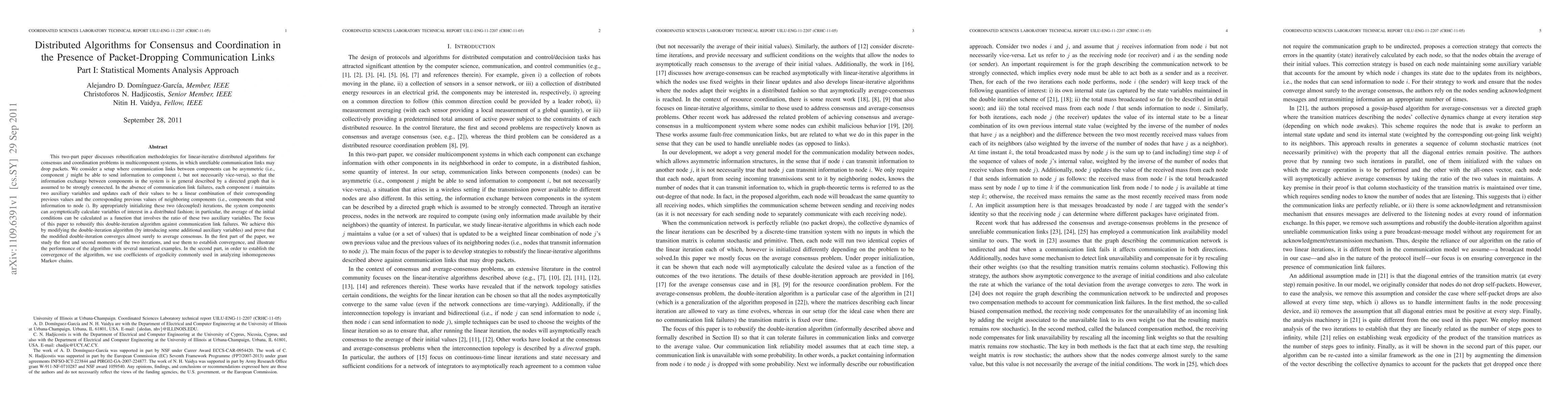 This two-part paper discusses robustification methodologies for linear-iterative distributed algorithms for consensus and coordination problems in multicomponent systems, in which unreliable communication links may drop packets. We consider a setup where communication links between components can be asymmetric (i.e., component j might be able to send information to component i, but not necessarily vice-versa), so that the information exchange between components in the system is in general described by a directed graph that is assumed to be strongly connected. In the absence of communication link failures, each component i maintains two auxiliary variables and updates each of their values to be a linear combination of their corresponding previous values and the corresponding previous values of neighboring components (i.e., components that send information to node i). By appropriately initializing these two (decoupled) iterations, the system components can asymptotically calculate variables of interest in a distributed fashion; in particular, the average of the initial conditions can be calculated as a function that involves the ratio of these two auxiliary variables. The focus of this paper to robustify this double-iteration algorithm against communication link failures. We achieve this by modifying the double-iteration algorithm (by introducing some additional auxiliary variables) and prove that the modified double-iteration converges almost surely to average consensus. In the first part of the paper, we study the first and second moments of the two iterations, and use them to establish convergence, and illustrate the performance of the algorithm with several numerical examples. In the second part, in order to establish the convergence of the algorithm, we use coefficients of ergodicity commonly used in analyzing inhomogeneous Markov chains.