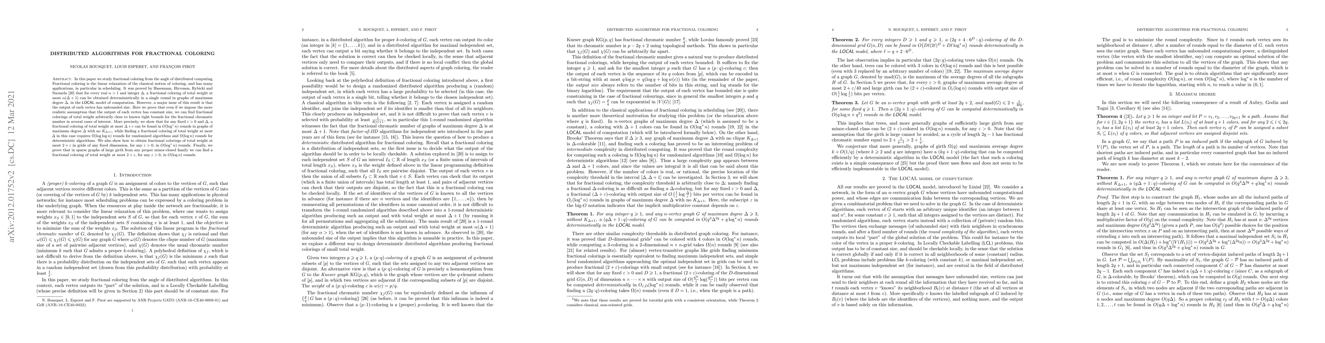 This paper investigates distributed algorithms for fractional coloring in various graph structures, demonstrating that fractional colorings of near-optimal weight can be achieved in logarithmic time under realistic constraints. It highlights the efficiency of achieving such colorings in specific graph types, including grids and sparse graphs, while noting the increased complexity for optimal colorings.