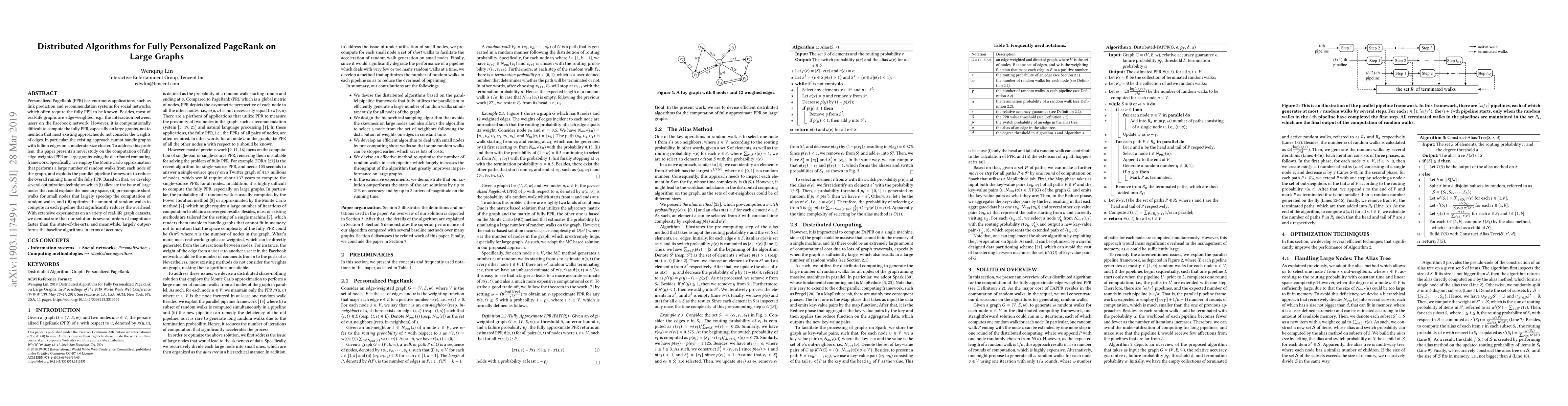 This paper proposes a distributed algorithm for efficiently computing fully personalized PageRank (PPR) on large, edge-weighted graphs using Monte Carlo approximation and parallel pipelines. The approach introduces optimizations to manage memory constraints, accelerate computation, and reduce overhead, achieving significant speedups over existing methods.