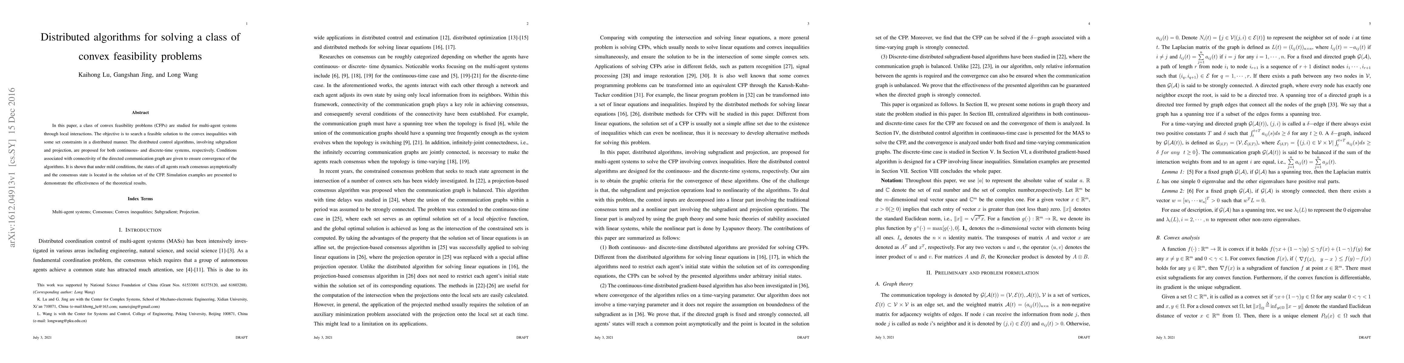 In this paper, a class of convex feasibility problems (CFPs) are studied for multi-agent systems through local interactions. The objective is to search a feasible solution to the convex inequalities with some set constraints in a distributed manner. The distributed control algorithms, involving subgradient and projection, are proposed for both continuous- and discrete-time systems, respectively. Conditions associated with connectivity of the directed communication graph are given to ensure convergence of the algorithms. It is shown that under mild conditions, the states of all agents reach consensus asymptotically and the consensus state is located in the solution set of the CFP. Simulation examples are presented to demonstrate the effectiveness of the theoretical results.
