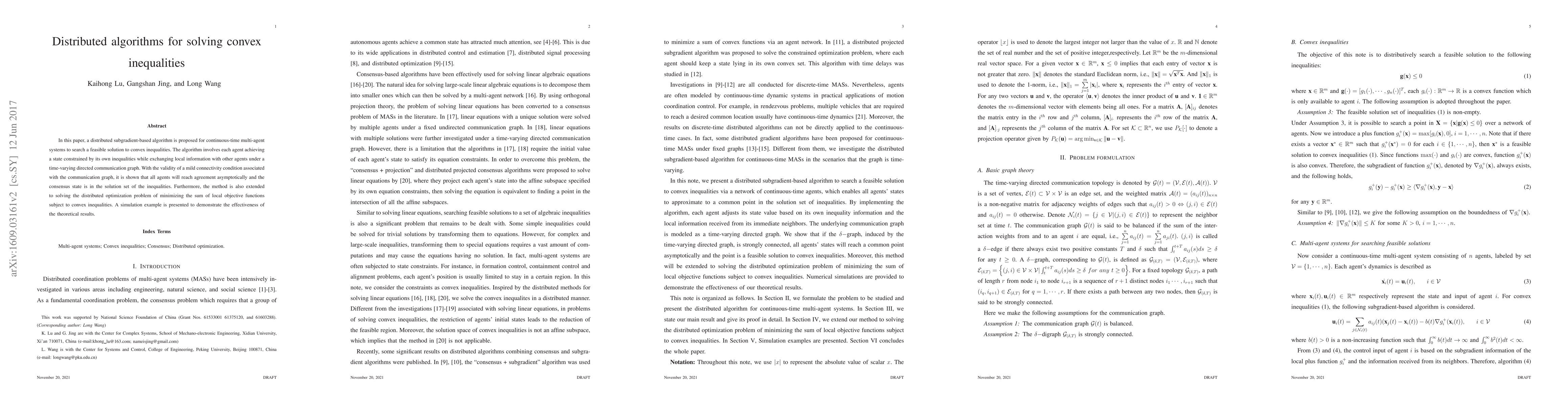 In this paper, a distributed subgradient-based algorithm is proposed for continuous-time multi-agent systems to search a feasible solution to convex inequalities. The algorithm involves each agent achieving a state constrained by its own inequalities while exchanging local information with other agents under a time-varying directed communication graph. With the validity of a mild connectivity condition associated with the communication graph, it is shown that all agents will reach agreement asymptotically and the consensus state is in the solution set of the inequalities. Furthermore, the method is also extended to solving the distributed optimization problem of minimizing the sum of local objective functions subject to convex inequalities. A simulation example is presented to demonstrate the effectiveness of the theoretical results.