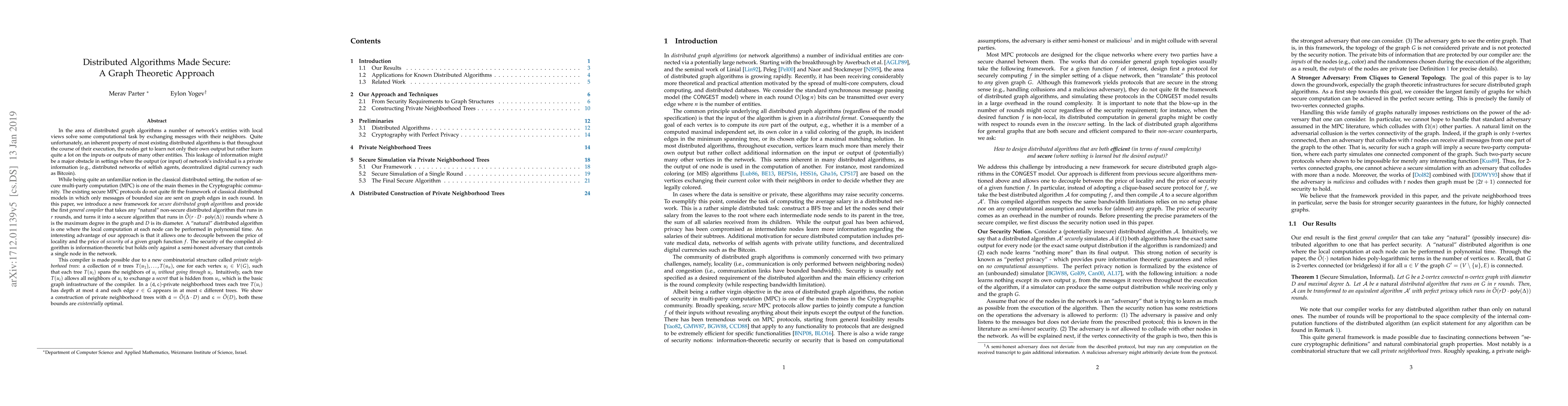 This paper presents a new framework for secure distributed graph algorithms, transforming non-secure algorithms into secure ones via a general compiler. The compiler runs in O(r cdot D cdot poly(Delta)) rounds, where r is the original algorithm's rounds, Δ is the maximum degree, and D is the diameter. Security is information-theoretic, protecting against a semi-honest adversary controlling a single node. This is achieved using private neighborhood trees, a combinatorial structure allowing secret exchange among neighbors without revealing to the node itself. The paper also provides a construction for these trees with depth ~O(Δ cdot D) and edge appearance in at most ~O(D) trees.