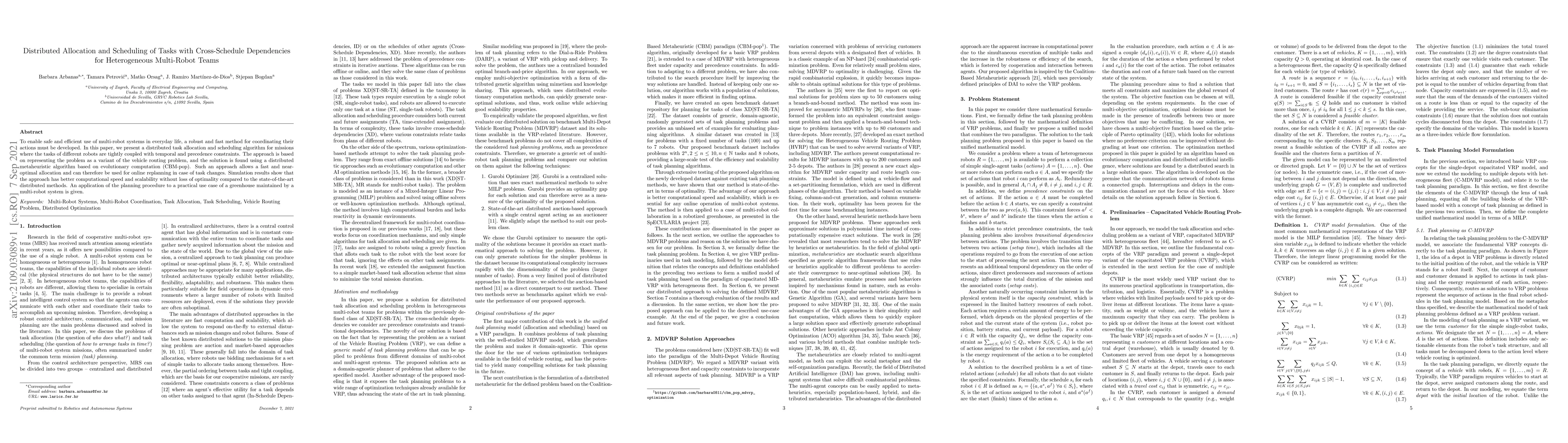 To enable safe and efficient use of multi-robot systems in everyday life, a robust and fast method for coordinating their actions must be developed. In this paper, we present a distributed task allocation and scheduling algorithm for missions where the tasks of different robots are tightly coupled with temporal and precedence constraints. The approach is based on representing the problem as a variant of the vehicle routing problem, and the solution is found using a distributed metaheuristic algorithm based on evolutionary computation (CBM-pop). Such an approach allows a fast and near-optimal allocation and can therefore be used for online replanning in case of task changes. Simulation results show that the approach has better computational speed and scalability without loss of optimality compared to the state-of-the-art distributed methods. An application of the planning procedure to a practical use case of a greenhouse maintained by a multi-robot system is given.
