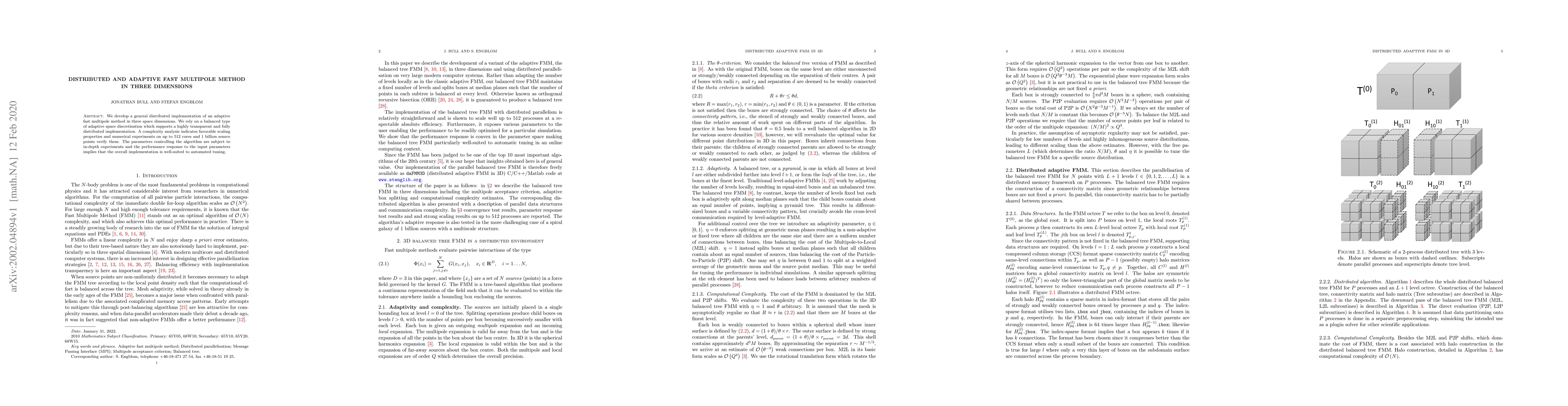 This paper presents a distributed and adaptive fast multipole method for three-dimensional problems, utilizing a balanced adaptive space discretization for efficient parallelization. Numerical experiments on up to 512 cores show favorable scaling, and parameter tuning is well-suited for automated optimization.