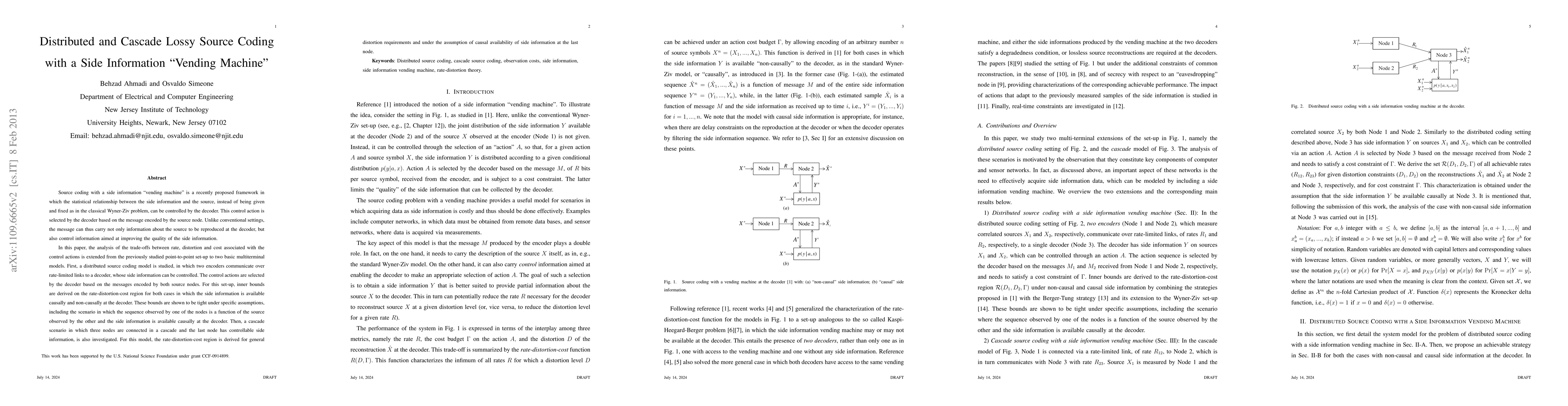 This paper extends the analysis of distributed and cascade lossy source coding with controllable side information, introducing a "vending machine" framework where the decoder can influence the statistical relationship between the side information and the source. It derives inner bounds for the rate-distortion-cost region in distributed and cascade models, showing tightness under specific conditions.
