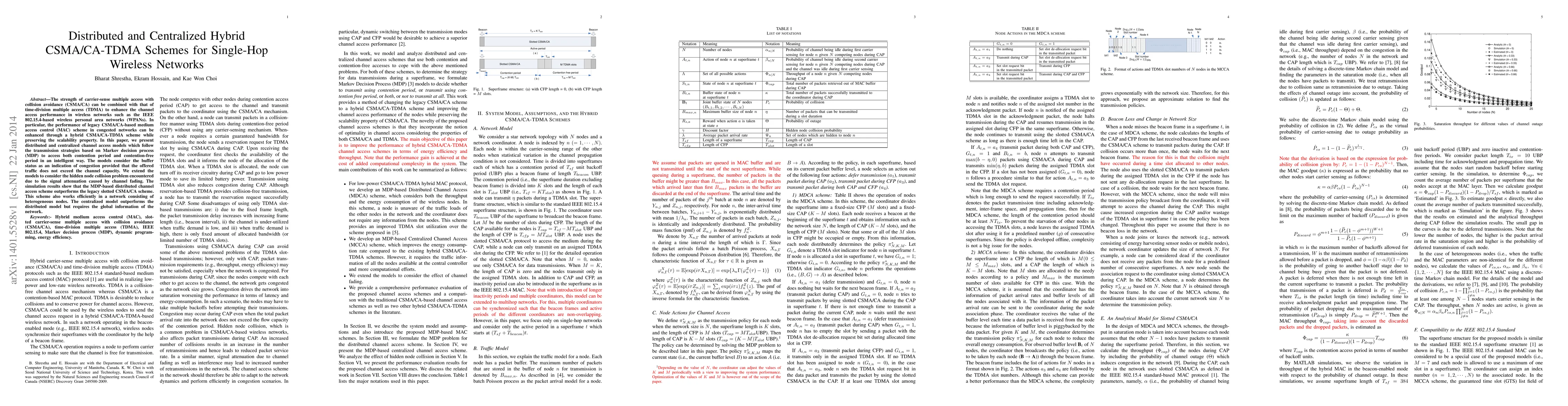 This paper proposes hybrid CSMA/CA-TDMA schemes for single-hop wireless networks to enhance channel access performance, presenting both distributed and centralized models based on Markov decision process. Simulation results indicate that the distributed model outperforms legacy CSMA/CA, while the centralized model requires global network information but performs better.