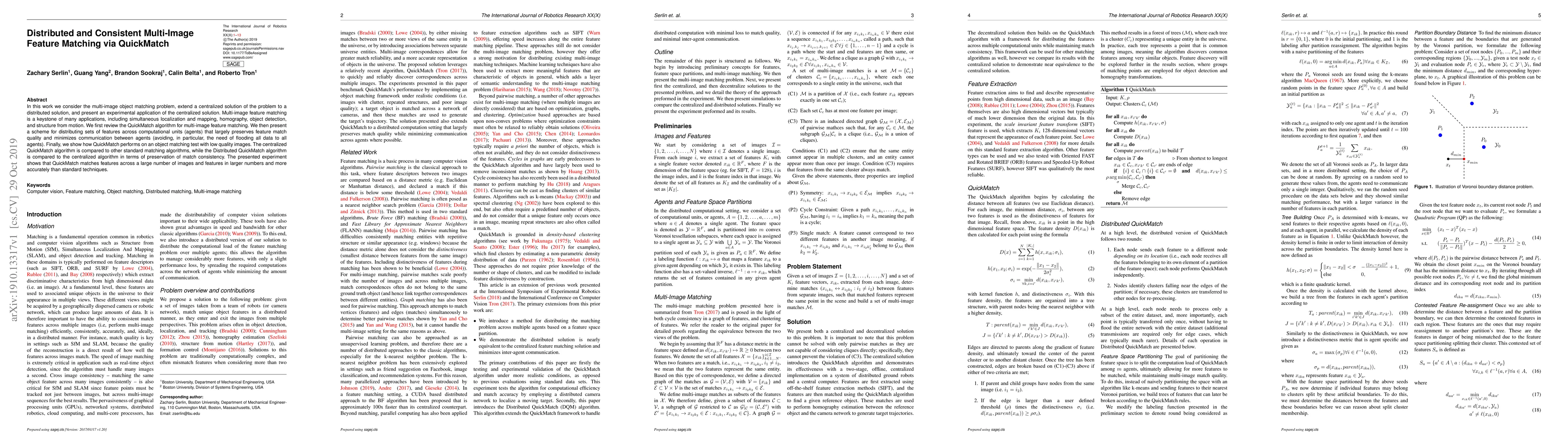 This paper presents a distributed version of the QuickMatch algorithm for multi-image feature matching, which maintains match quality while minimizing communication. The distributed approach outperforms standard techniques in feature matching accuracy and consistency across numerous images.