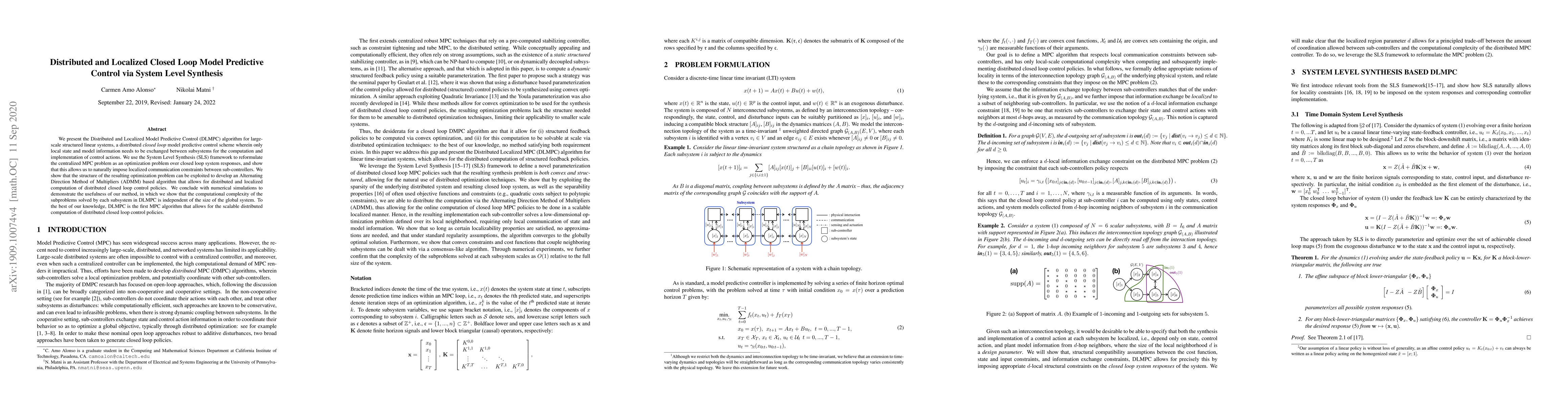 The paper introduces the Distributed and Localized Model Predictive Control (DLMPC) algorithm for large-scale systems, utilizing the System Level Synthesis framework to reformulate MPC as an optimization problem, allowing localized communication and distributed computation. Numerical simulations show that DLMPC maintains computational efficiency regardless of the global system size.