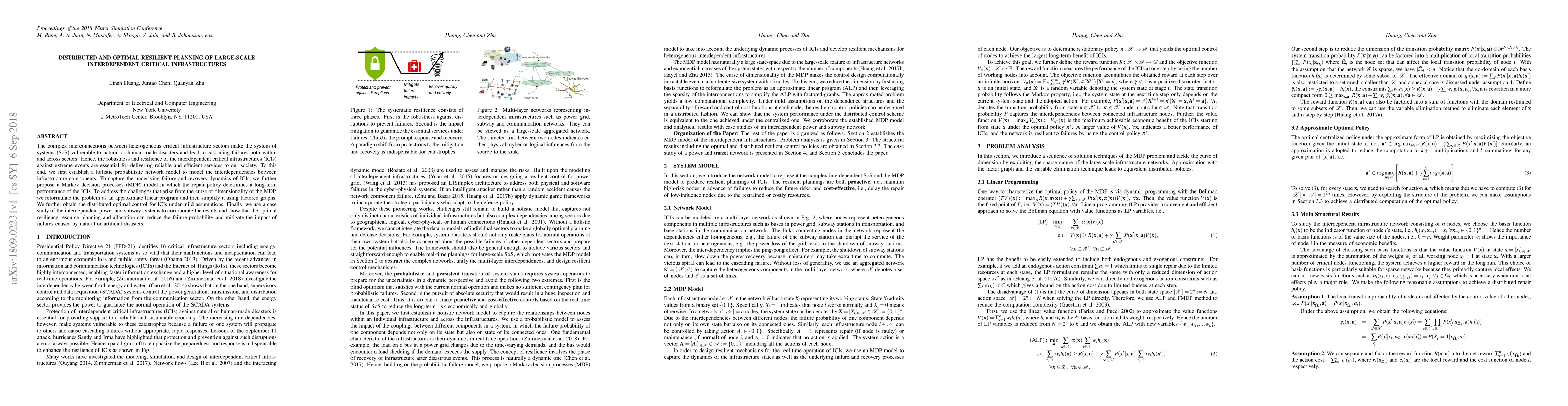 This paper develops a probabilistic network model and a Markov decision process to optimize resilience planning for large-scale interdependent critical infrastructures. It reformulates the problem as an approximate linear program and uses factored graphs for distributed optimal control, demonstrating reduced failure probability and impact through a case study of power and subway systems.