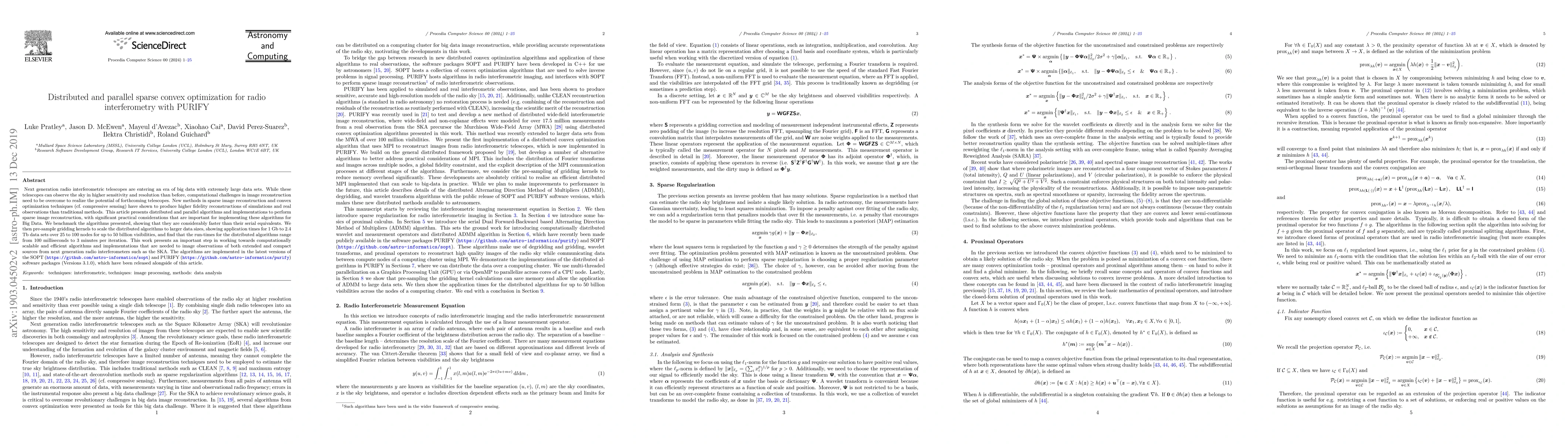 This paper introduces distributed and parallel algorithms for sparse convex optimization in radio interferometry, significantly speeding up the reconstruction of large datasets. The proposed methods, implemented in SOPT and PURIFY, achieve run-times from 100 ms to 3 minutes per iteration, demonstrating scalability for up to 50 billion visibilities across 25 to 100 nodes.