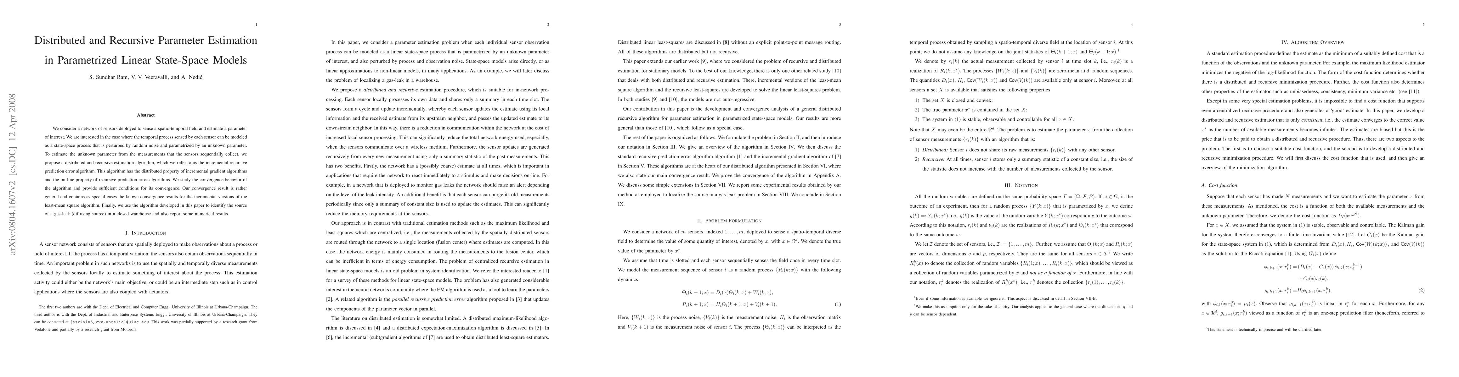 We consider a network of sensors deployed to sense a spatio-temporal field and estimate a parameter of interest. We are interested in the case where the temporal process sensed by each sensor can be modeled as a state-space process that is perturbed by random noise and parametrized by an unknown parameter. To estimate the unknown parameter from the measurements that the sensors sequentially collect, we propose a distributed and recursive estimation algorithm, which we refer to as the incremental recursive prediction error algorithm. This algorithm has the distributed property of incremental gradient algorithms and the on-line property of recursive prediction error algorithms. We study the convergence behavior of the algorithm and provide sufficient conditions for its convergence. Our convergence result is rather general and contains as special cases the known convergence results for the incremental versions of the least-mean square algorithm. Finally, we use the algorithm developed in this paper to identify the source of a gas-leak (diffusing source) in a closed warehouse and also report numerical simulations to verify convergence.