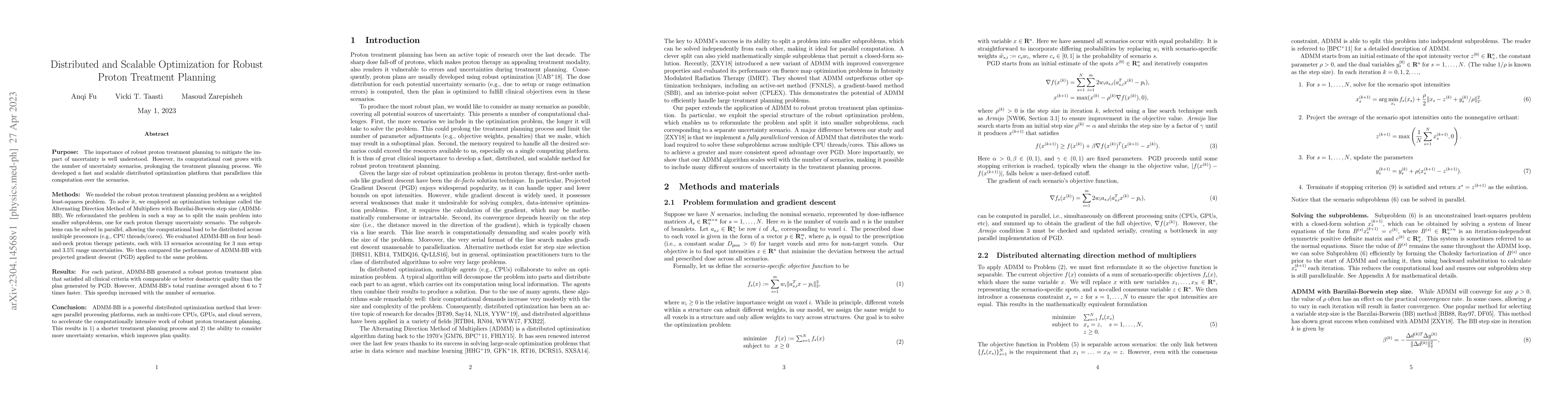 This paper presents a distributed optimization platform using the ADMM-BB method to accelerate robust proton treatment planning, significantly reducing computation time compared to traditional PGD. The platform effectively parallelizes the computation across multiple processors, resulting in faster treatment planning and the ability to handle more uncertainty scenarios.