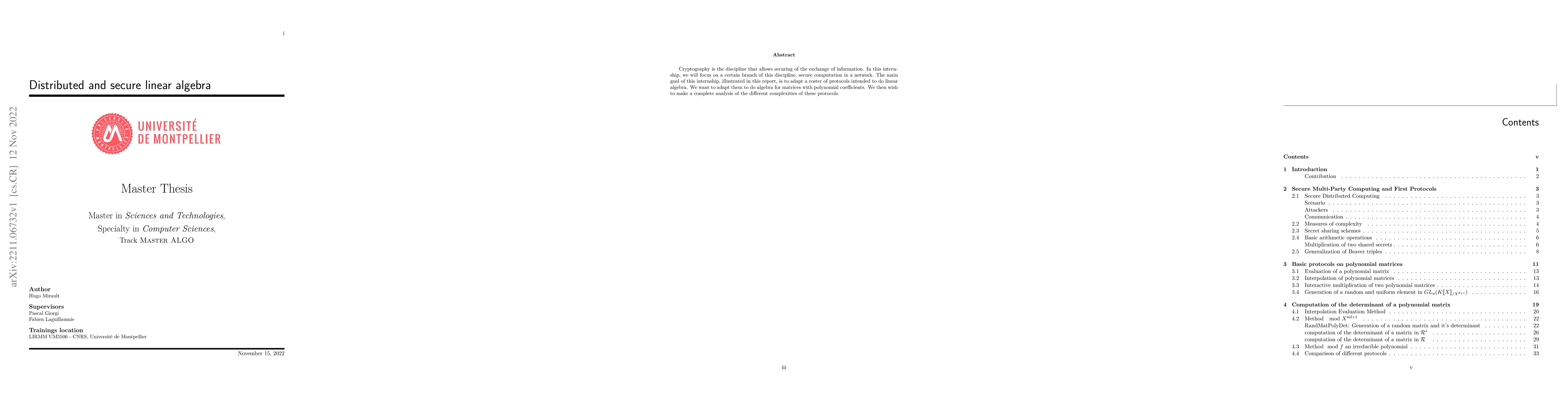 This thesis explores secure computation in networks, focusing on adapting linear algebra protocols for matrices with polynomial coefficients. The study aims to analyze the complexities of these adapted protocols for secure information exchange.