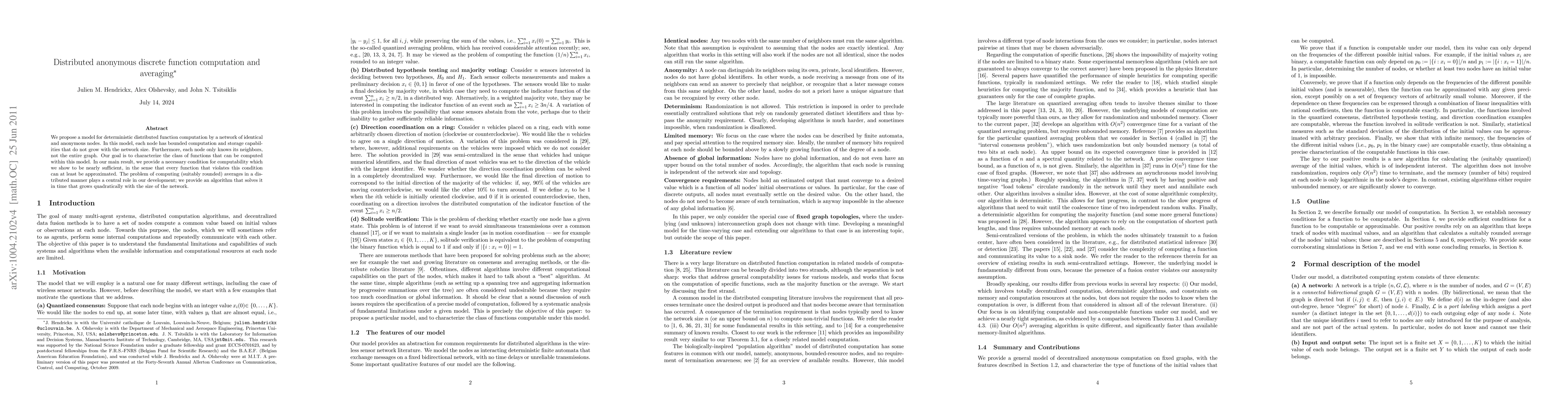 Researchers propose a model for distributed function computation by a network of anonymous nodes with bounded capabilities. They provide an algorithm to compute averages in time growing quadratically with the network size.
