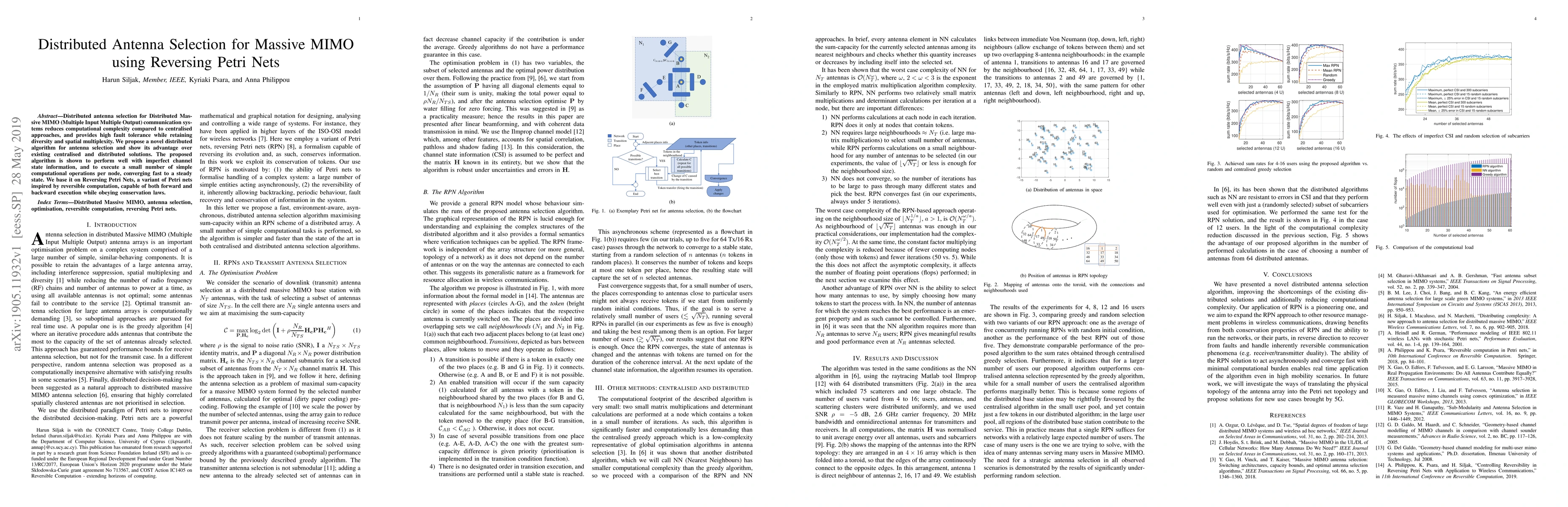 Distributed antenna selection for Distributed Massive MIMO (Multiple Input Multiple Output) communication systems reduces computational complexity compared to centralised approaches, and provides high fault tolerance while retaining diversity and spatial multiplexity. We propose a novel distributed algorithm for antenna selection and show its advantage over existing centralised and distributed solutions. The proposed algorithm is shown to perform well with imperfect channel state information, and to execute a small number of simple computational operations per node, converging fast to a steady state. We base it on Reversing Petri Nets, a variant of Petri nets inspired by reversible computation, capable of both forward and backward execution while obeying conservation laws.