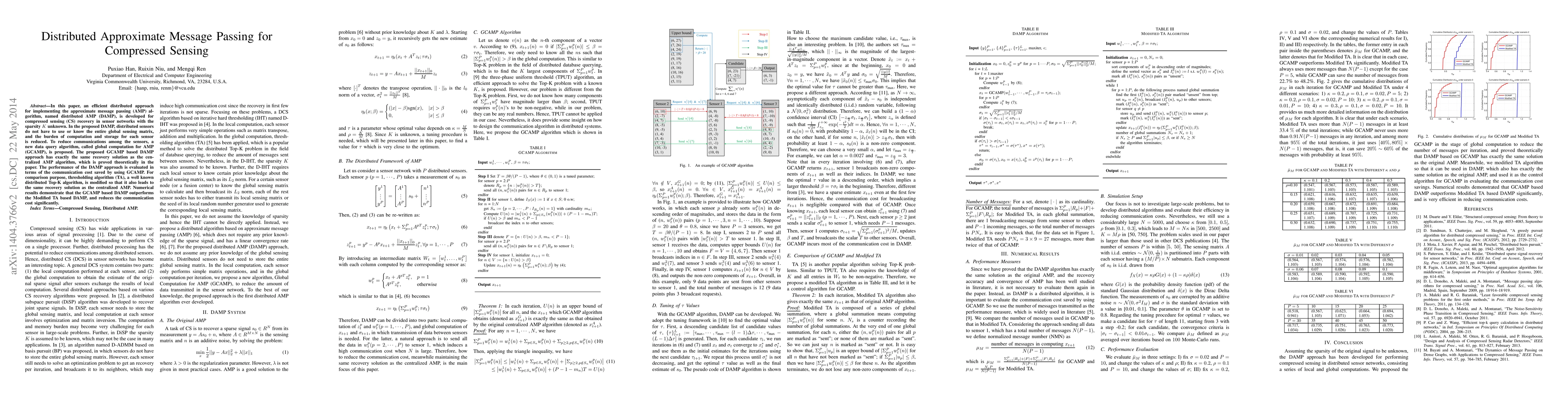 This paper introduces distributed AMP (DAMP) for compressed sensing in sensor networks, reducing computation and storage per sensor. It proposes a new data query algorithm, GCAMP, to minimize communication costs while maintaining the same recovery solution as the centralized AMP algorithm, outperforming a modified thresholding algorithm in terms of communication efficiency.