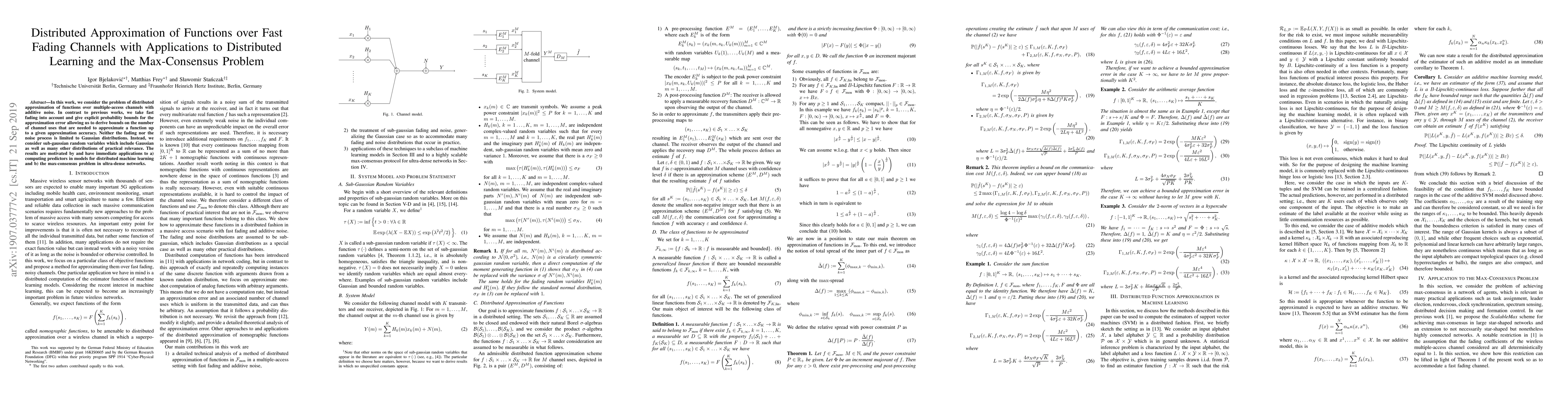 In this work, we consider the problem of distributed approximation of functions over multiple-access channels with additive noise. In contrast to previous works, we take fast fading into account and give explicit probability bounds for the approximation error allowing us to derive bounds on the number of channel uses that are needed to approximate a function up to a given approximation accuracy. Neither the fading nor the noise process is limited to Gaussian distributions. Instead, we consider sub-gaussian random variables which include Gaussian as well as many other distributions of practical relevance. The results are motivated by and have immediate applications to a) computing predictors in models for distributed machine learning and b) the max-consensus problem in ultra-dense networks.