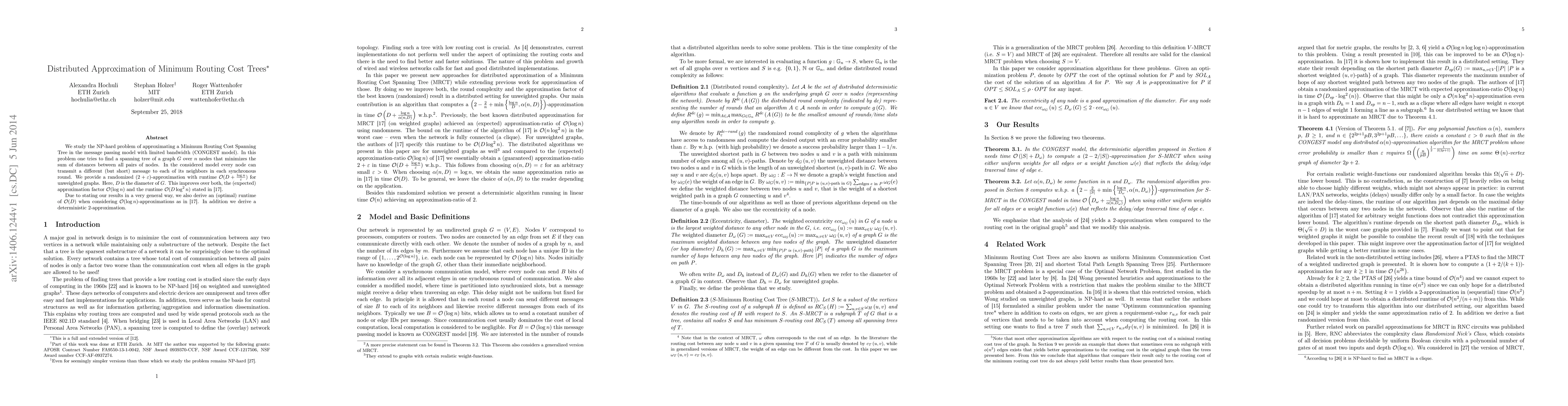 We study the NP-hard problem of approximating a Minimum Routing Cost Spanning Tree in the message passing model with limited bandwidth (CONGEST model). In this problem one tries to find a spanning tree of a graph $G$ over $n$ nodes that minimizes the sum of distances between all pairs of nodes. In the considered model every node can transmit a different (but short) message to each of its neighbors in each synchronous round. We provide a randomized $(2+\epsilon)$-approximation with runtime $O(D+\frac{\log n}{\epsilon})$ for unweighted graphs. Here, $D$ is the diameter of $G$. This improves over both, the (expected) approximation factor $O(\log n)$ and the runtime $O(D\log^2 n)$ of the best previously known algorithm. Due to stating our results in a very general way, we also derive an (optimal) runtime of $O(D)$ when considering $O(\log n)$-approximations as done by the best previously known algorithm. In addition we derive a deterministic $2$-approximation.