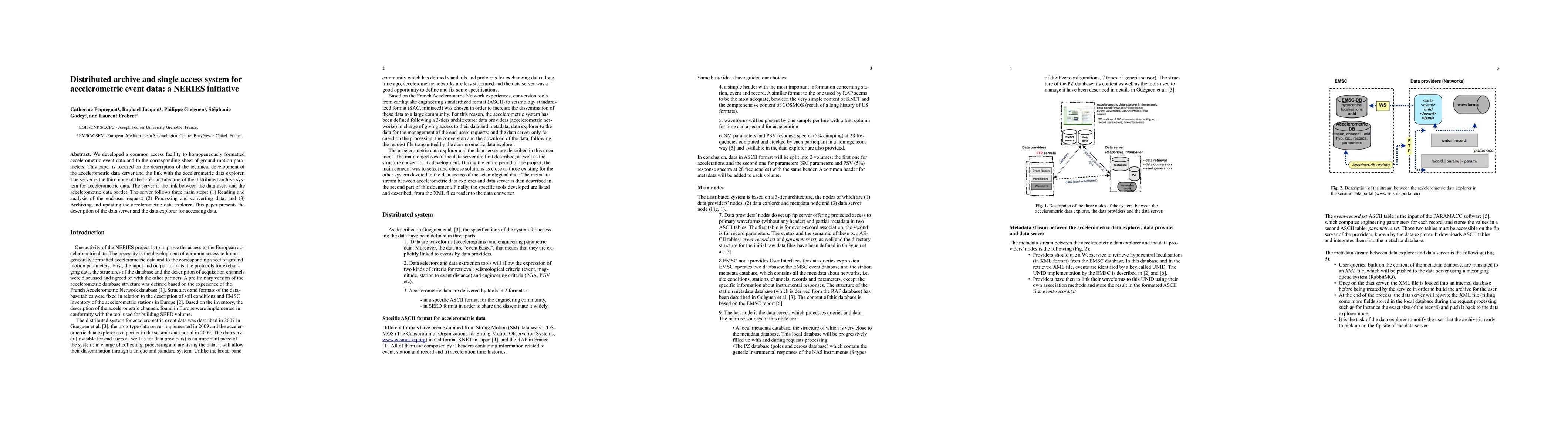 This paper describes the development of a distributed archive server for standardized accelerometric event data, which serves as a link between users and the data portal, following steps for request analysis, data processing, and archiving. The server is part of a three-tier architecture and interfaces with an accelerometric data explorer for data access.