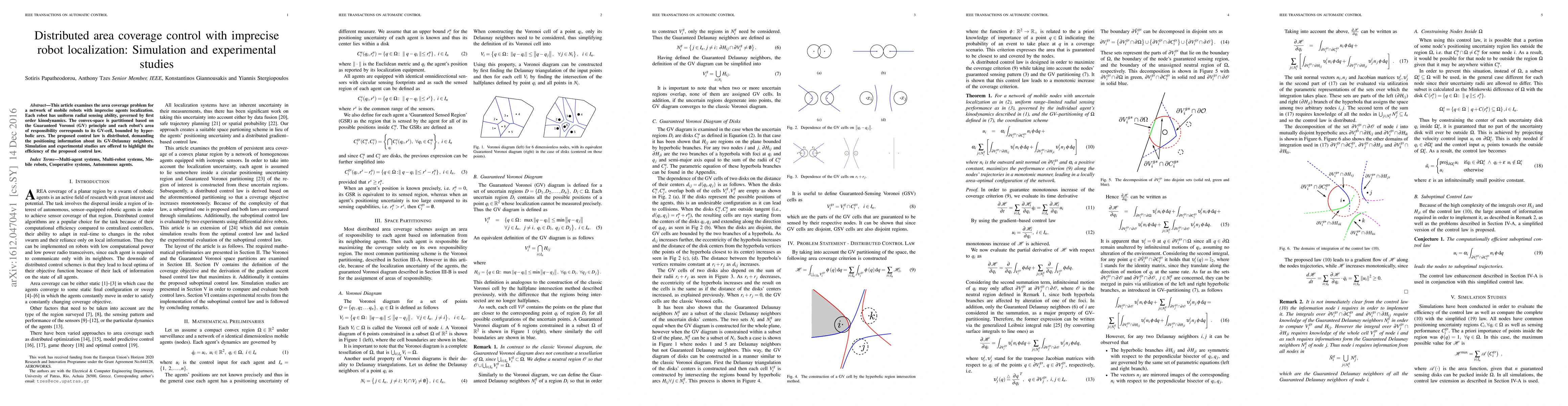 This article examines the area coverage problem for a network of mobile robots with imprecise agents' localization. Each robot has uniform radial sensing ability, governed by first order kinodynamics. The convex-space is partitioned based on the Guaranteed Voronoi (GV) principle and each robot's area of responsibility corresponds to its GV-cell, bounded by hyperbolic arcs. The proposed control law is distributed, demanding the positioning information about its GV-Delaunay neighbors. Simulation and experimental studies are offered to highlight the efficiency of the proposed control law.