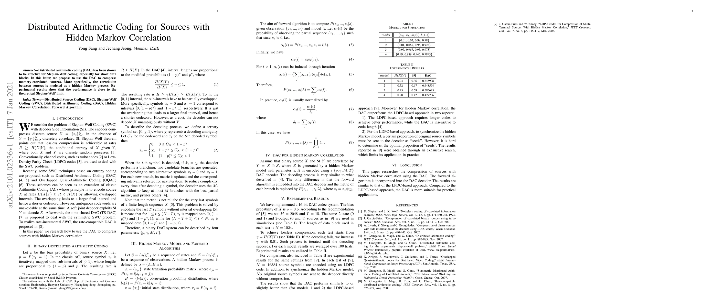 This paper proposes using distributed arithmetic coding (DAC) to compress memory-correlated sources modeled as a hidden Markov process, achieving performance near the theoretical Slepian-Wolf limit for short data blocks. Experimental results validate the effectiveness of the approach.