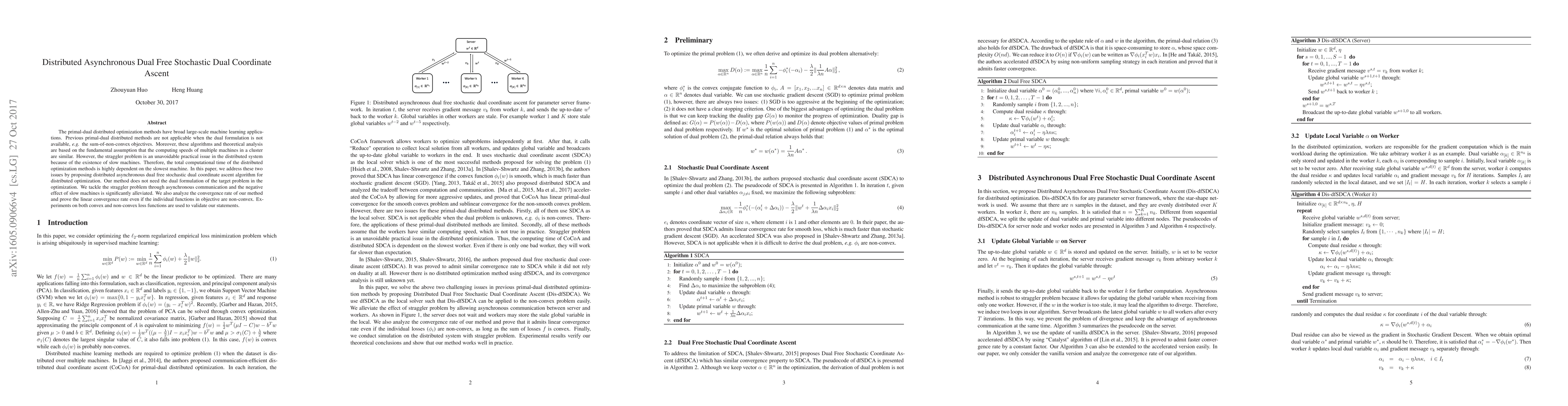 This paper proposes a distributed asynchronous dual-free stochastic dual coordinate ascent algorithm for large-scale optimization, addressing the lack of dual formulation applicability and the straggler problem in distributed systems. The method achieves linear convergence even for non-convex objectives and mitigates the impact of slow machines through asynchronous communication.