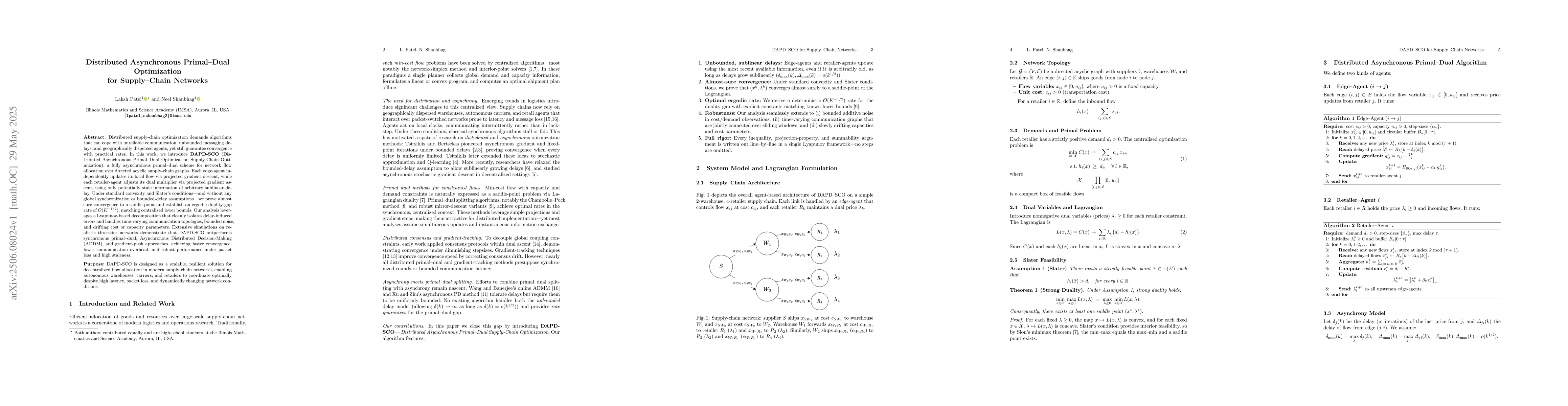 The paper presents DAPD-SCO, a novel asynchronous primal-dual optimization method for supply-chain networks that handles unreliable communication, unbounded delays, and geographically dispersed agents, proving almost-sure convergence and an ergodic duality gap rate of O(K^-1/2).