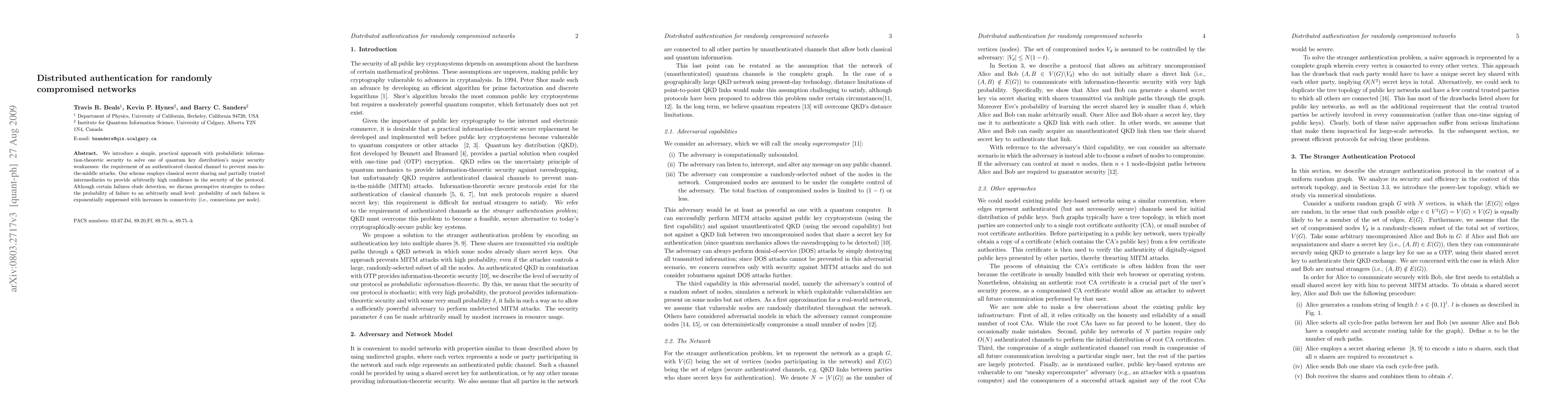 A new authentication scheme is proposed to secure quantum key distribution by using classical secret sharing and partially trusted intermediaries to prevent man-in-the-middle attacks. The scheme provides arbitrarily high confidence in security with exponentially suppressed probability of failure as connectivity increases.