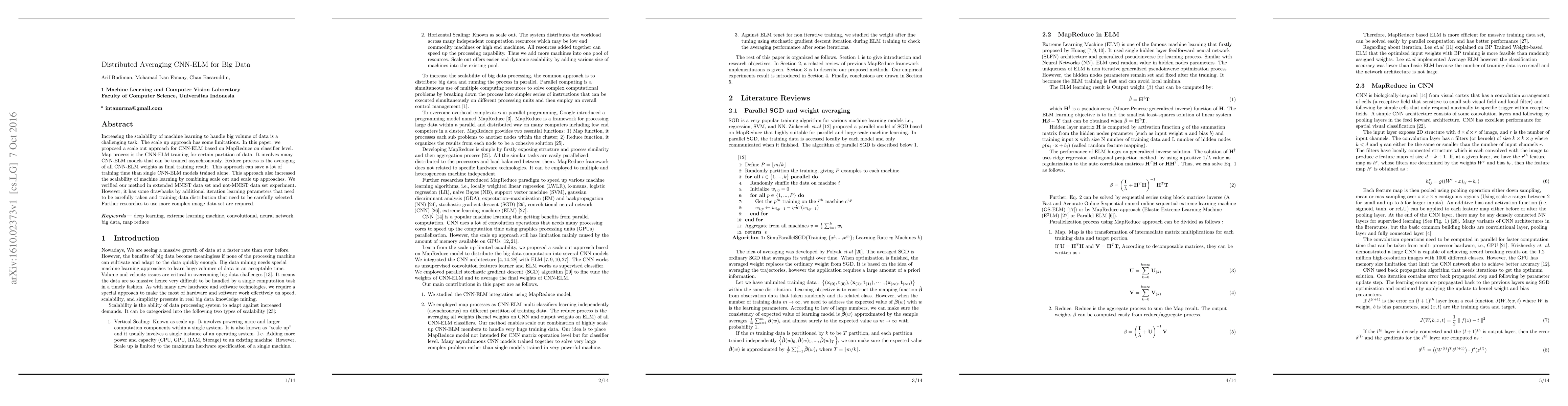 This paper proposes a distributed averaging CNN-ELM approach using MapReduce to enhance scalability for big data. The method trains multiple CNN-ELM models asynchronously and averages their weights for improved efficiency, validated on extended MNIST and not-MNIST datasets, though it requires careful handling of additional learning parameters and data distribution.