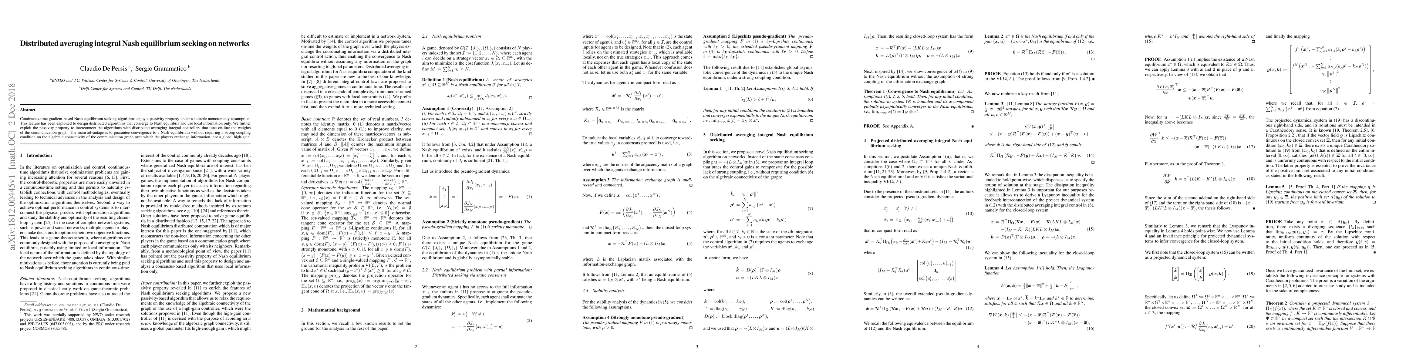 Continuous-time gradient-based Nash equilibrium seeking algorithms enjoy a passivity property under a suitable monotonicity assumption. This feature has been exploited to design distributed algorithms that converge to Nash equilibria and use local information only. We further exploit the passivity property to interconnect the algorithms with distributed averaging integral controllers that tune on-line the weights of the communication graph. The main advantage is to guarantee convergence to a Nash equilibrium without requiring a strong coupling condition on the algebraic connectivity of the communication graph over which the players exchange information, nor a global high-gain.