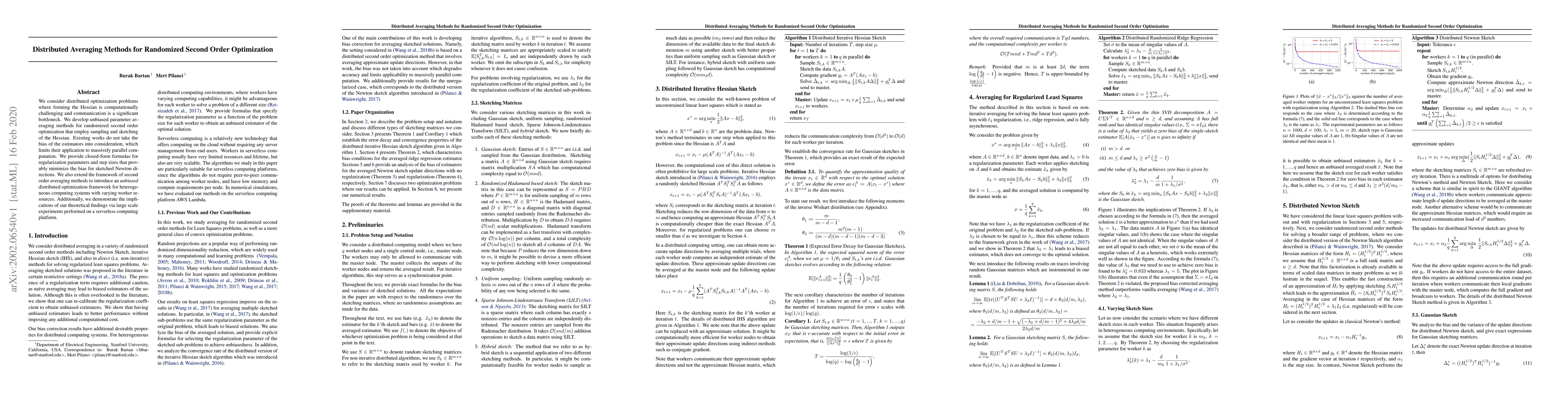 We consider distributed optimization problems where forming the Hessian is computationally challenging and communication is a significant bottleneck. We develop unbiased parameter averaging methods for randomized second order optimization that employ sampling and sketching of the Hessian. Existing works do not take the bias of the estimators into consideration, which limits their application to massively parallel computation. We provide closed-form formulas for regularization parameters and step sizes that provably minimize the bias for sketched Newton directions. We also extend the framework of second order averaging methods to introduce an unbiased distributed optimization framework for heterogeneous computing systems with varying worker resources. Additionally, we demonstrate the implications of our theoretical findings via large scale experiments performed on a serverless computing platform.