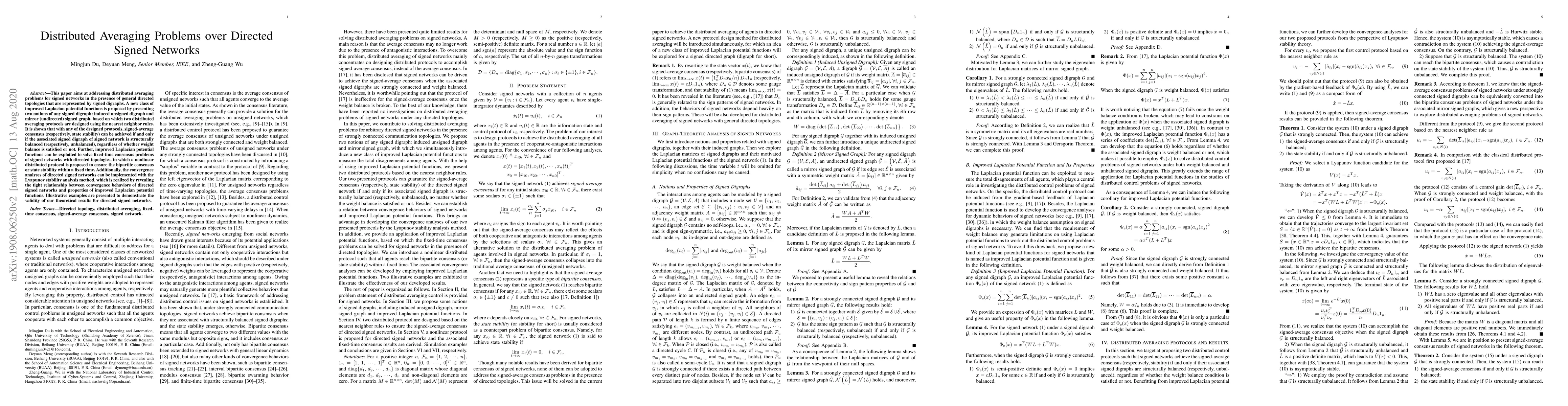 This paper proposes improved Laplacian potential functions and distributed averaging protocols for achieving consensus in directed signed networks, demonstrating that consensus and stability depend on the structural balance of the network, regardless of weight balance. A nonlinear protocol ensures fixed-time consensus, and Lyapunov stability analysis confirms the convergence behaviors.
