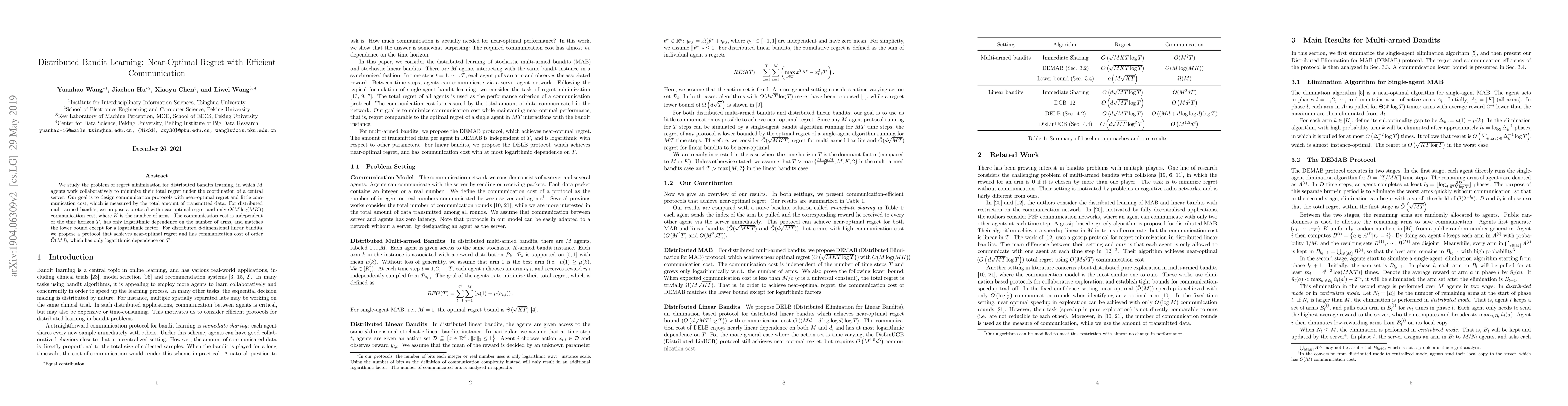This paper proposes efficient communication protocols for distributed bandit learning, achieving near-optimal regret with minimal communication costs. For distributed multi-armed bandits, it achieves $O(M\log(MK))$ communication cost, while for linear bandits, it achieves $\tilde{O}(Md)$ communication cost, both with logarithmic dependence on time horizon.