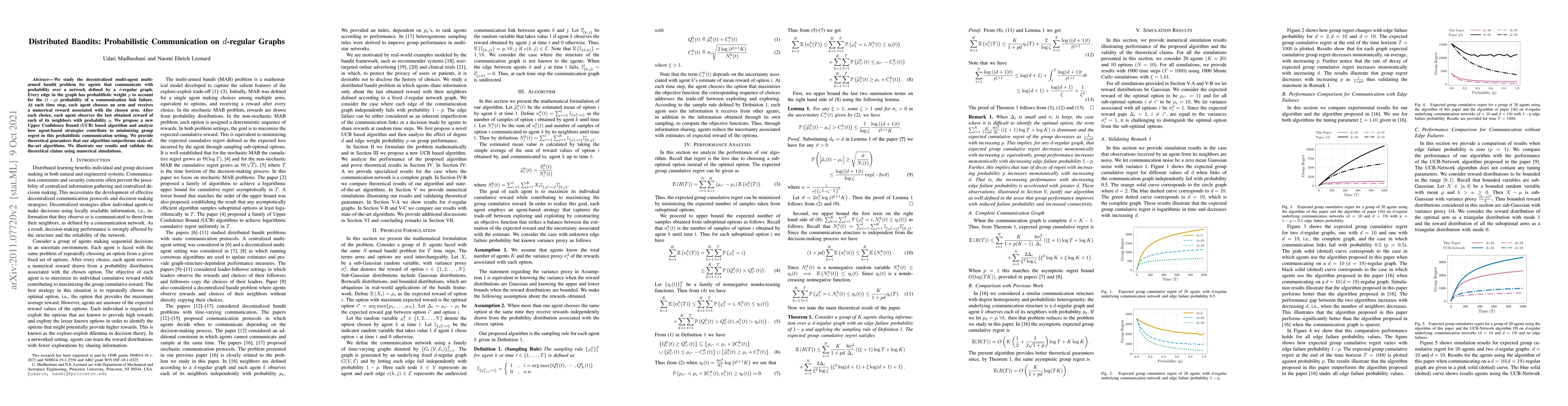 We study the decentralized multi-agent multi-armed bandit problem for agents that communicate with probability over a network defined by a $d$-regular graph. Every edge in the graph has probabilistic weight $p$ to account for the ($1\!-\!p$) probability of a communication link failure. At each time step, each agent chooses an arm and receives a numerical reward associated with the chosen arm. After each choice, each agent observes the last obtained reward of each of its neighbors with probability $p$. We propose a new Upper Confidence Bound (UCB) based algorithm and analyze how agent-based strategies contribute to minimizing group regret in this probabilistic communication setting. We provide theoretical guarantees that our algorithm outperforms state-of-the-art algorithms. We illustrate our results and validate the theoretical claims using numerical simulations.